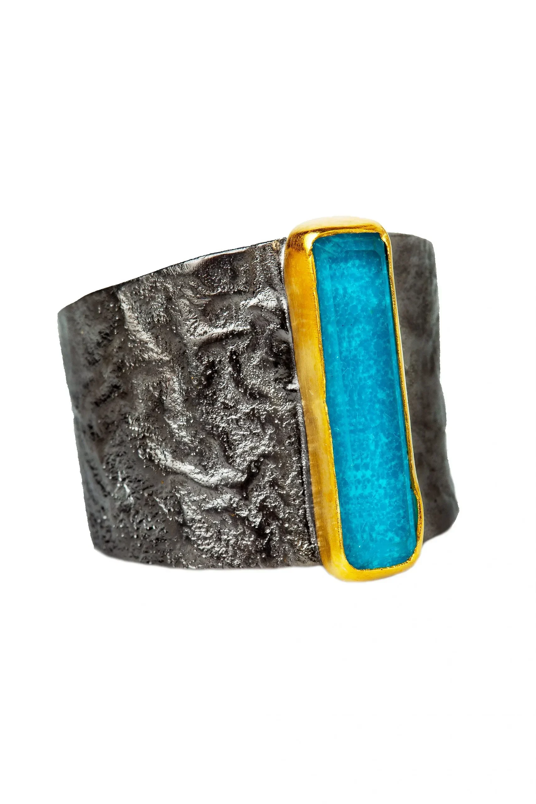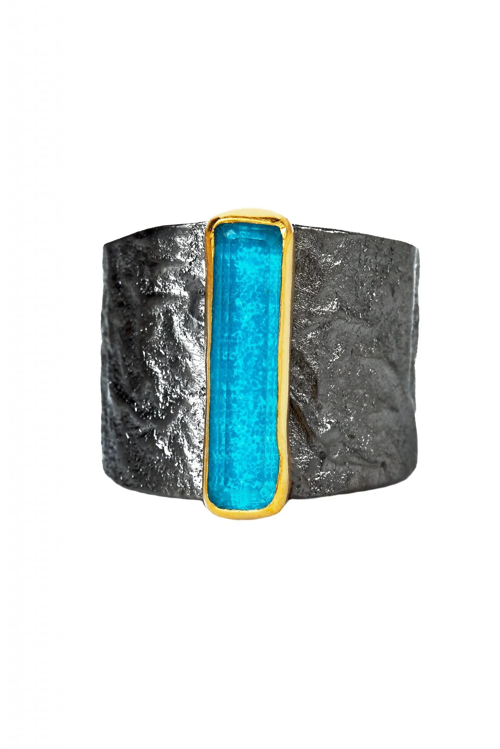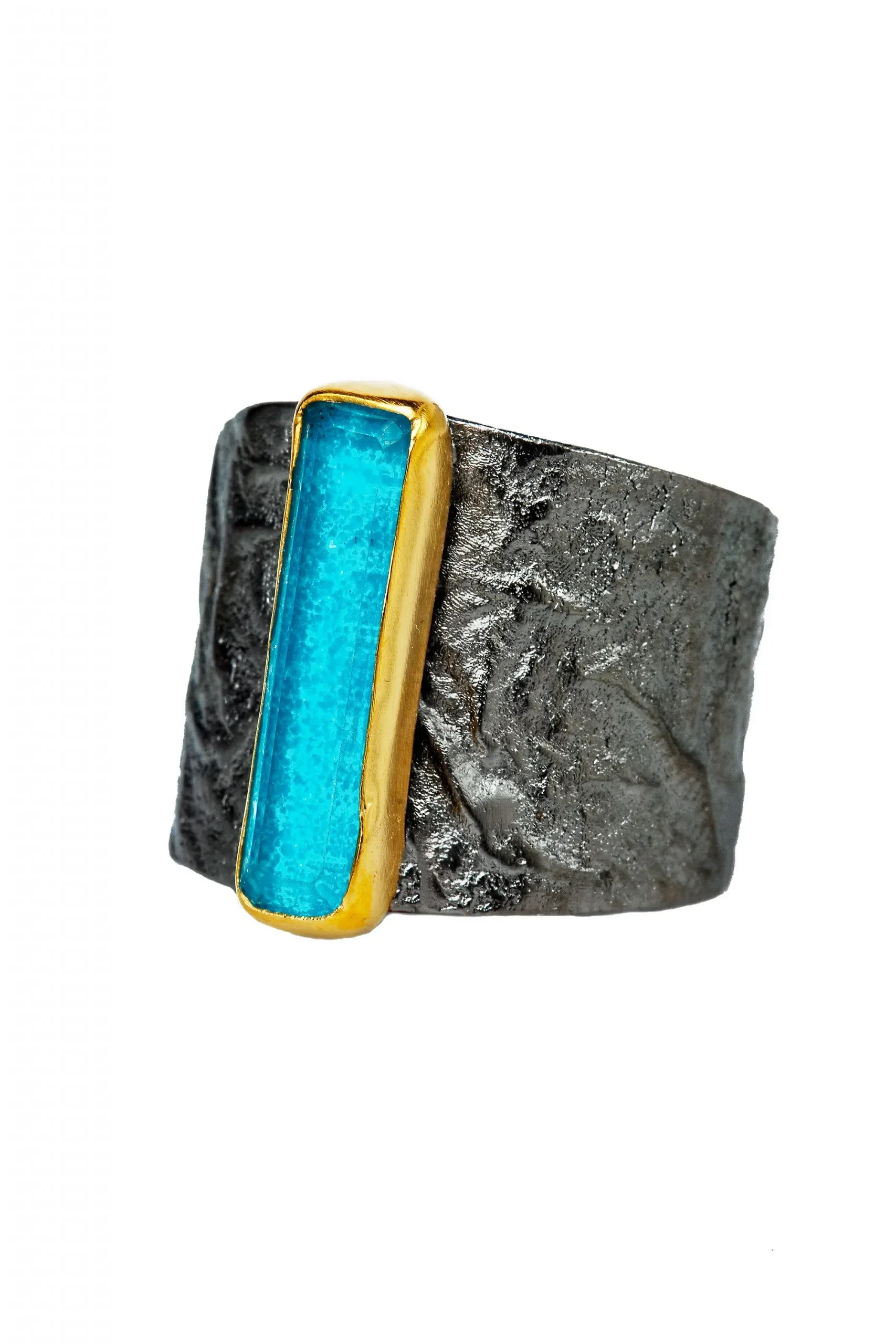This unique and stylish Apatite textured black plated silver ring is perfect for adding a subtle yet elegant touch to any outfit. Crafted with sterling silver and black plating, this eye-catching ring features a textured design with an apatite gemstone at the centre. Its sleek and modern design is sure to stand out and make a statement, while its lightweight and comfortable fit makes it perfect for everyday wear. Show off your unique style with this sophisticated and stylish Apatite textured black plated silver ring.