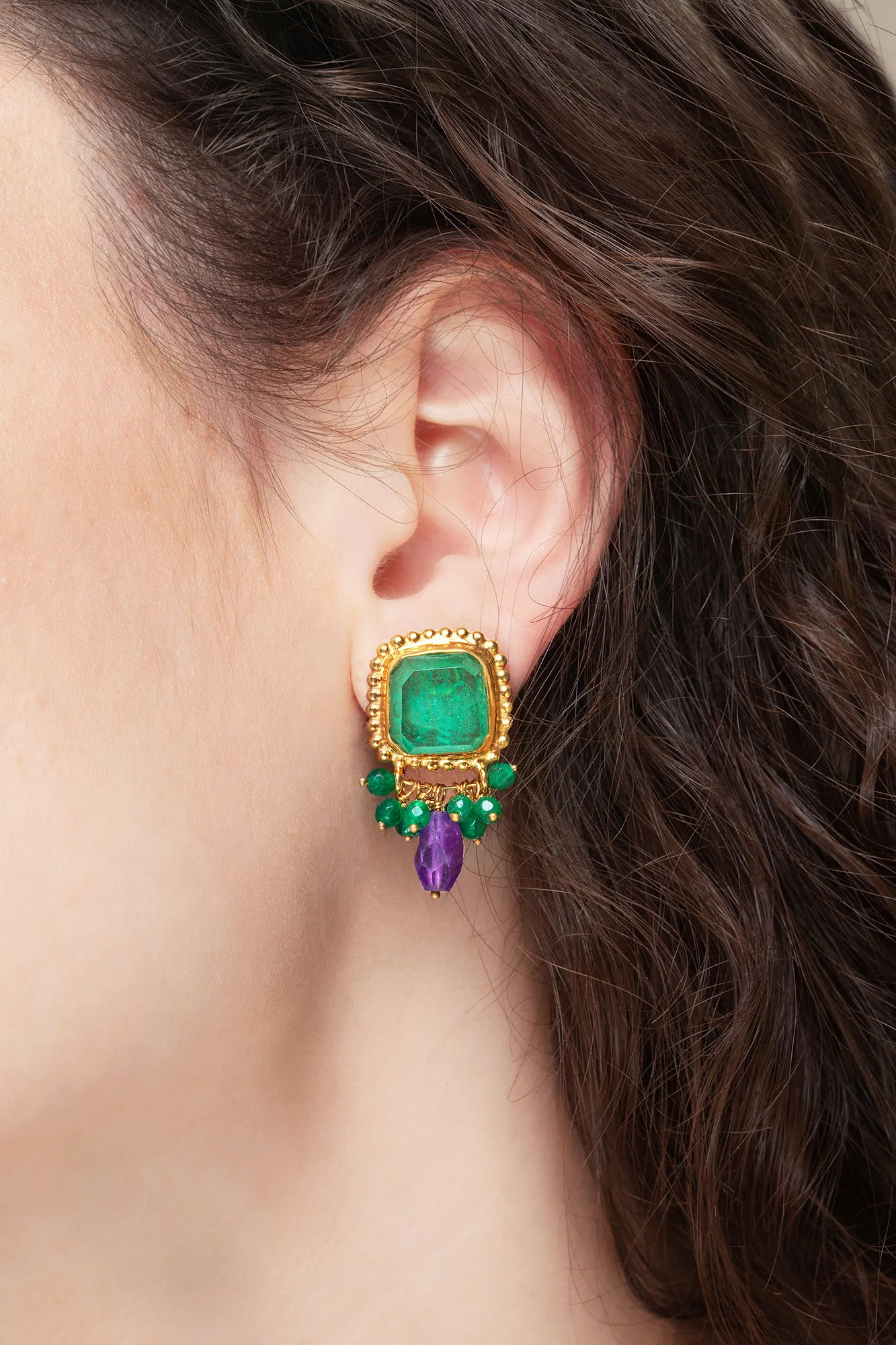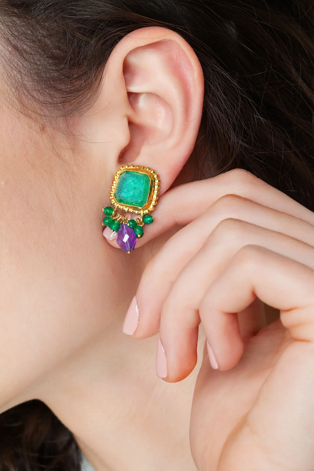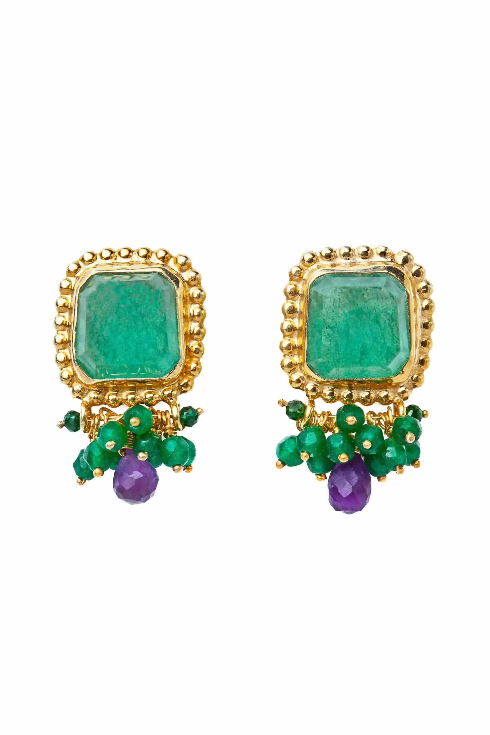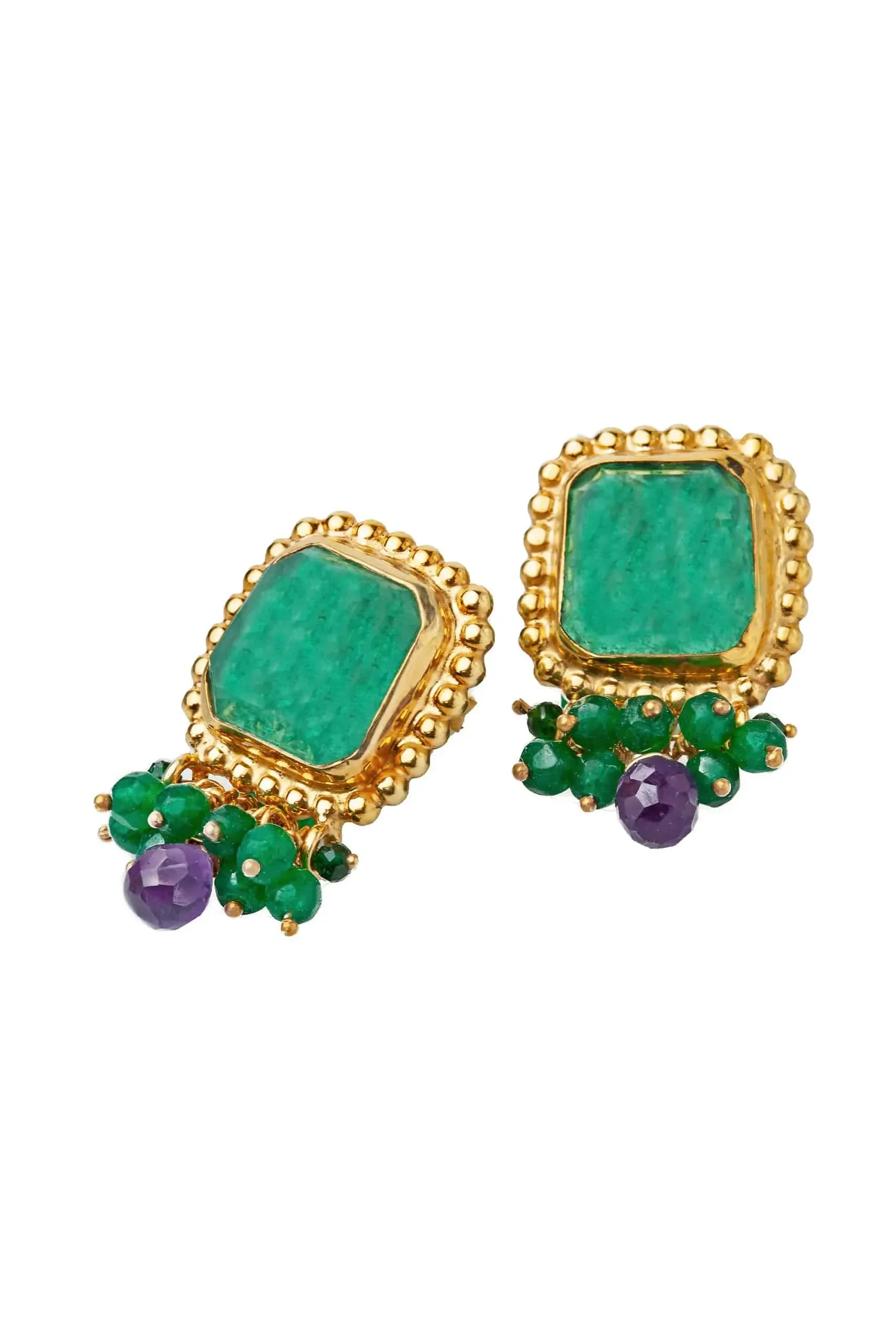 Aventurine gold plated silver earrings combined with green agate and amethyst