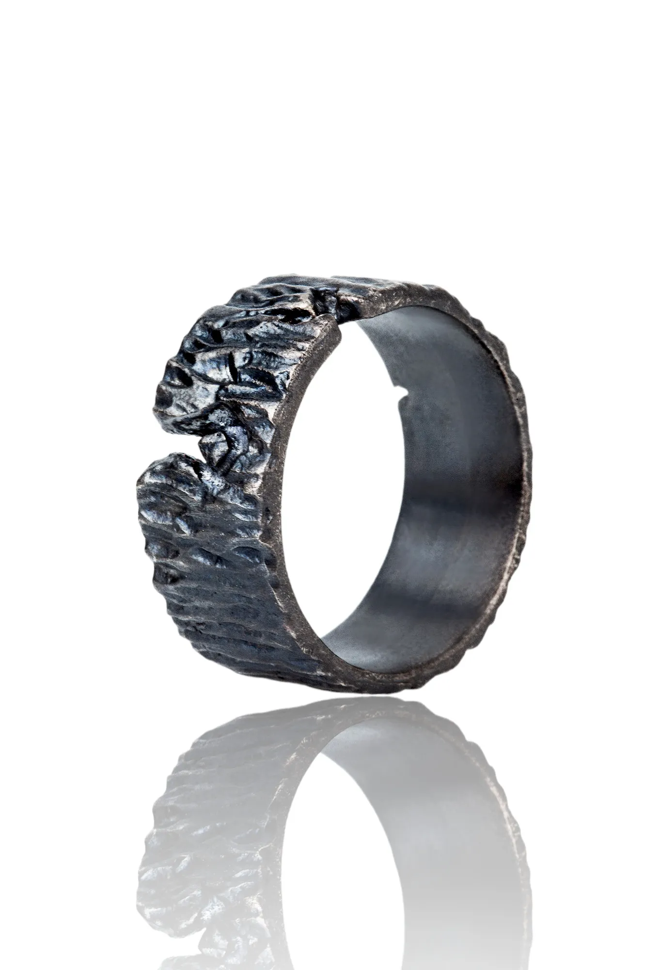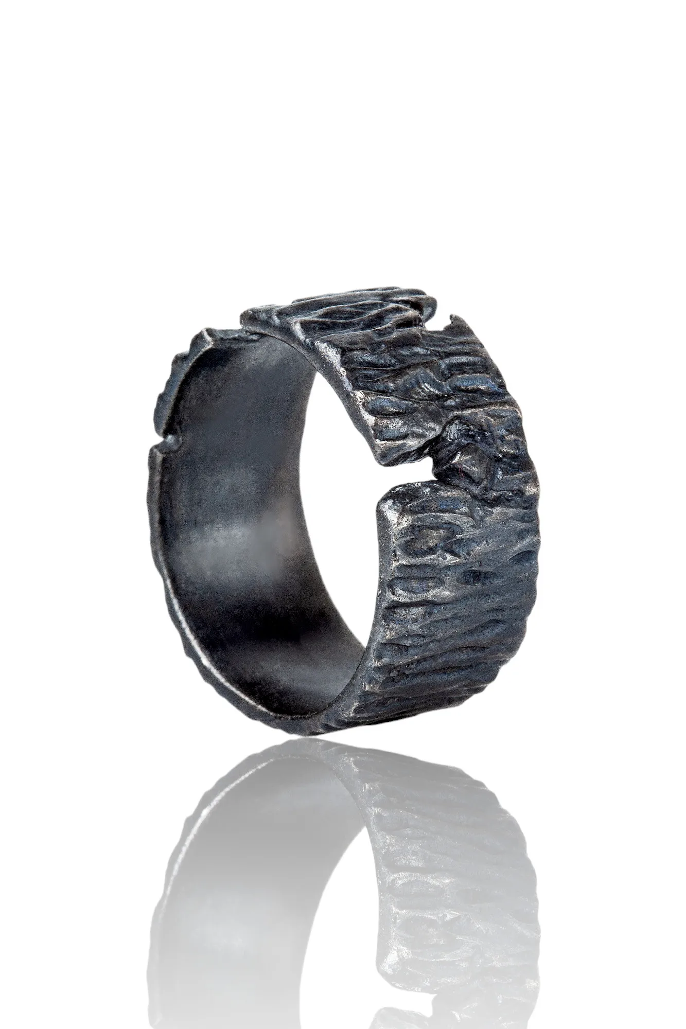 Introducing our stunning ‘bark’ handmade textured black rhodium plated silver ring, a true statement piece for any jewellery collection. This exquisite ring features a unique texture, meticulously crafted by hand for a one-of-a-kind look. The black rhodium plating adds a touch of edginess and sophistication, making it perfect for both casual and formal occasions. Its sturdy construction ensures durability, while the silver material adds a touch of elegance. With its timeless design and expert craftsmanship, this ring is the perfect accessory for any fashion-forward individual. Elevate your style with our ‘Bark’ ring today.
