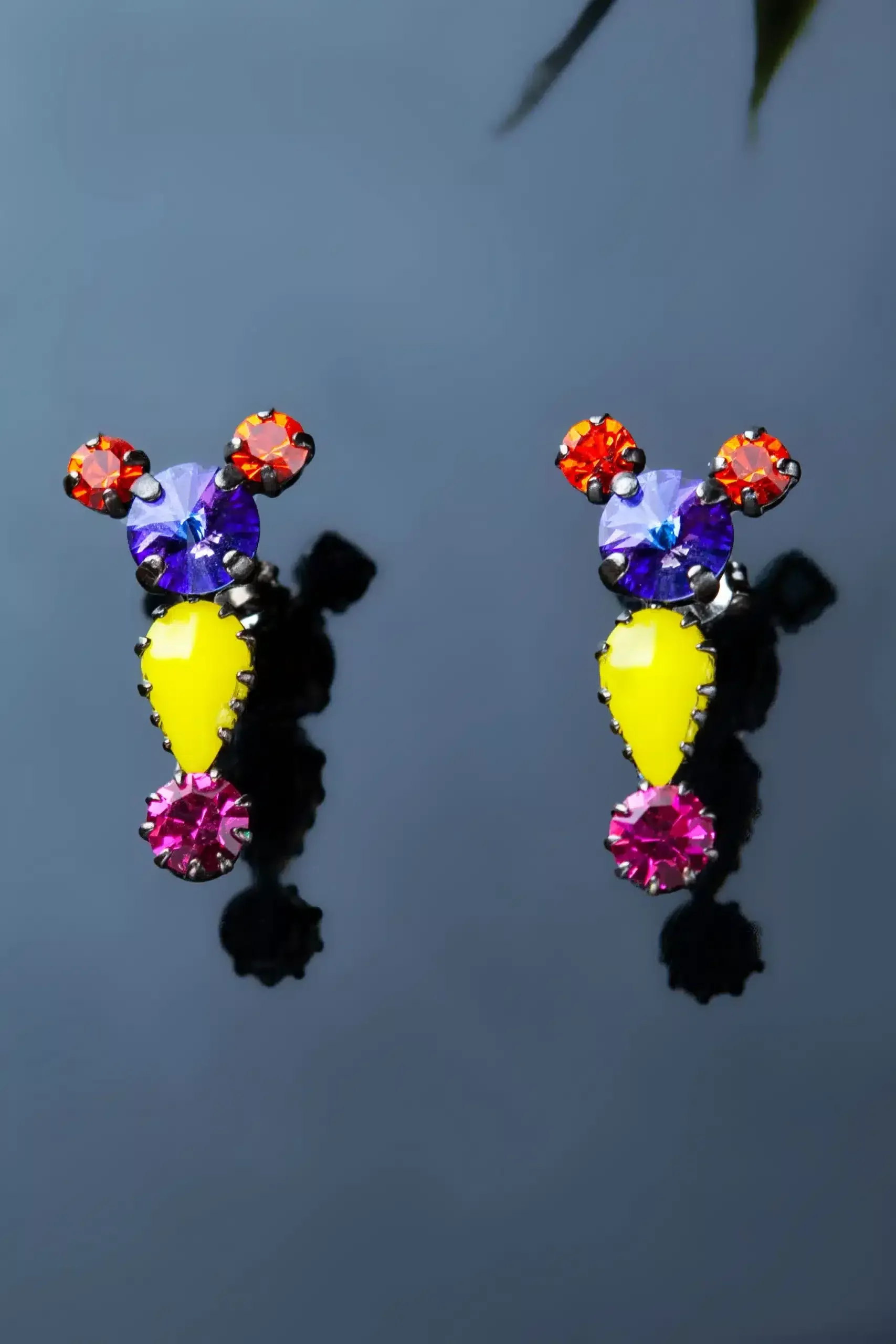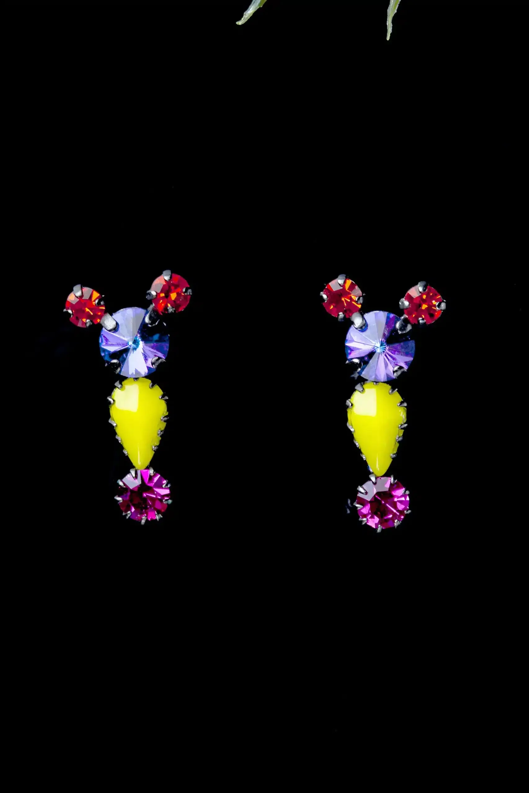 Bronze earrings, black rhodium plated with semi precious decorations and multicoloured Swarovski crystals. Silver 925 pushbacks.