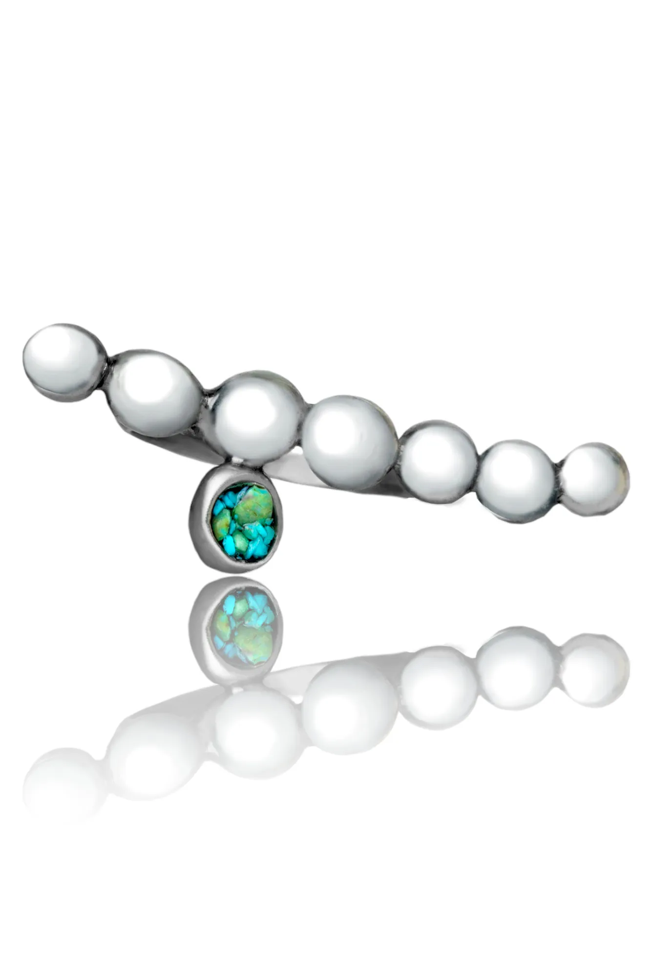 Introducing our stunning Bubble handmade silver ring, adorned with a beautiful turquoise gemstone. This exquisite piece is expertly crafted by skilled artisans, making each ring one-of-a-kind. The unique bubbled texture of the silver band adds a touch of elegance to the design, while the vibrant turquoise stone adds a pop of colour. This ring is not only a fashion statement but also carries healing properties, known for promoting peace and tranquillity. Perfect for any occasion, this turquoise ring will make a statement wherever you go. Order now and add this handcrafted beauty to your jewellery collection.