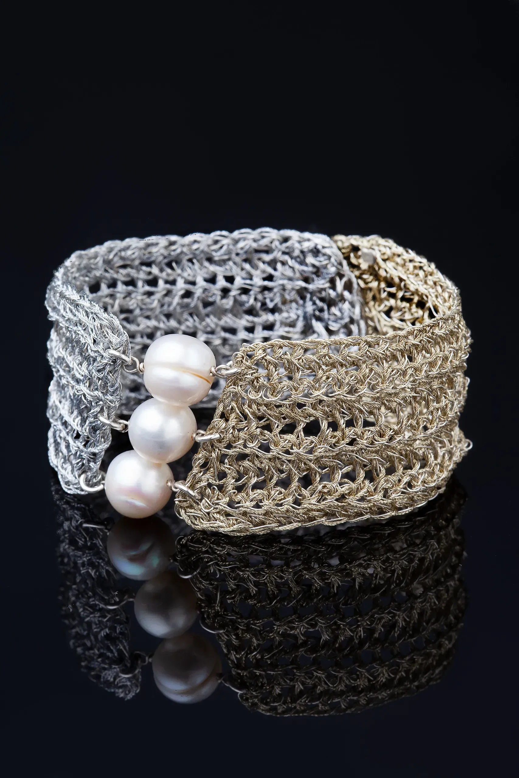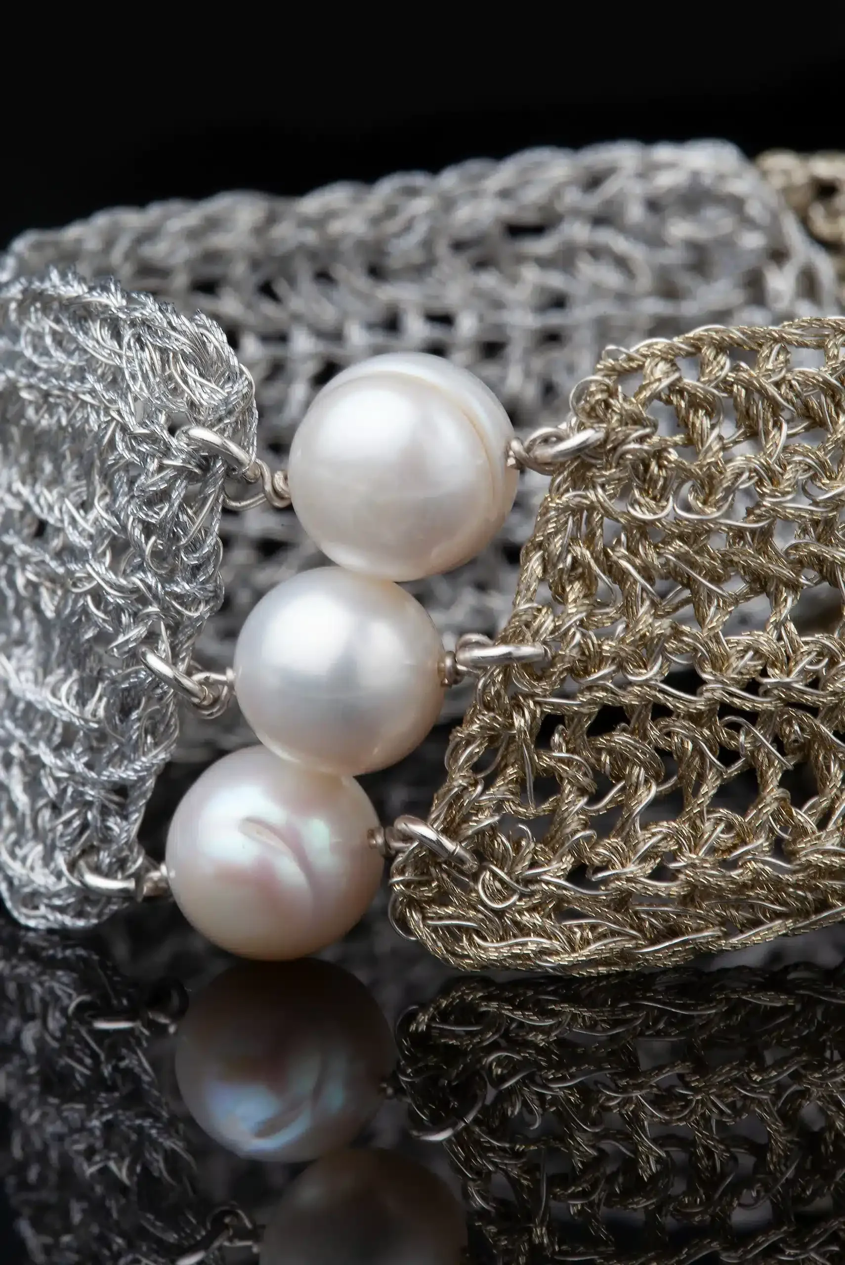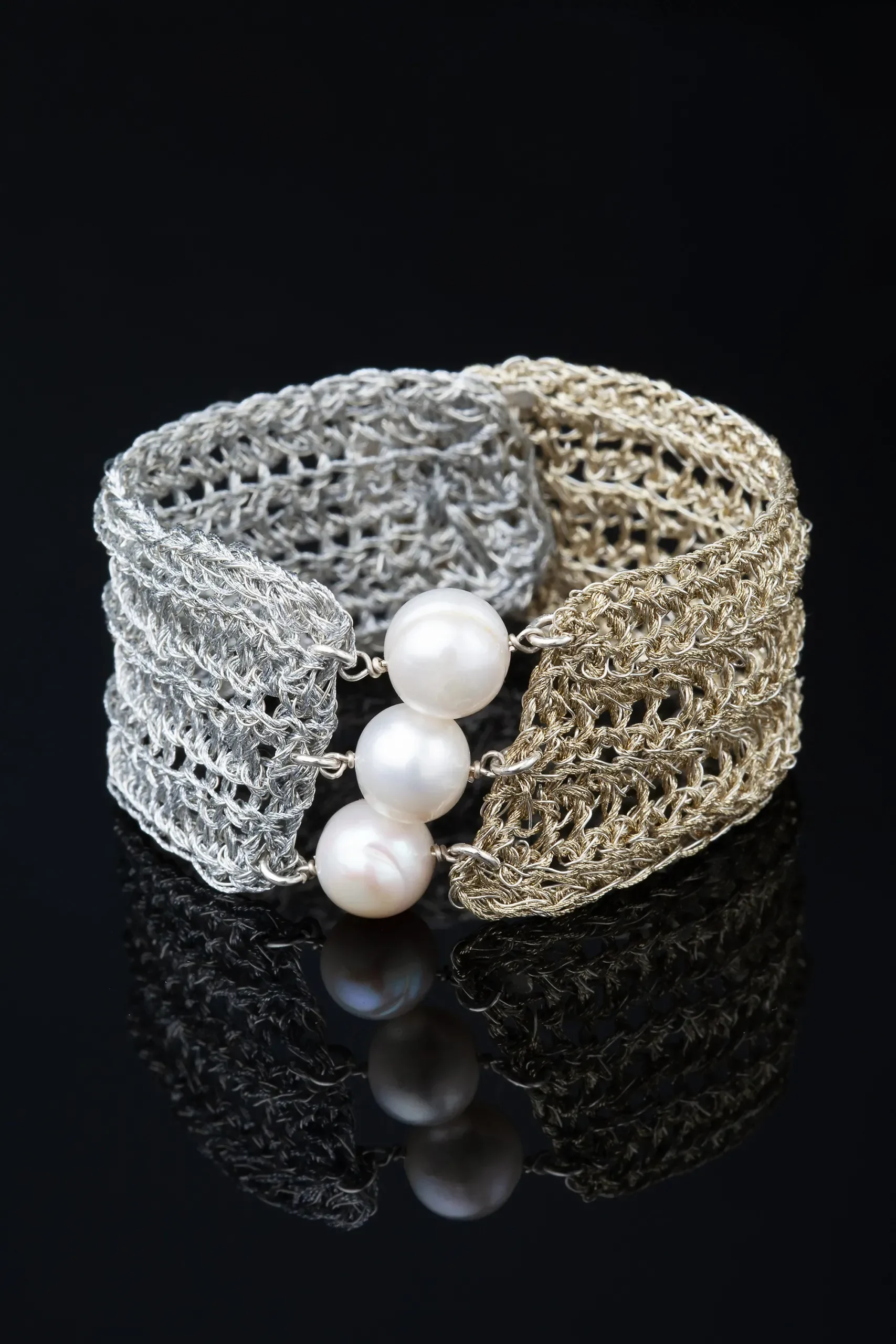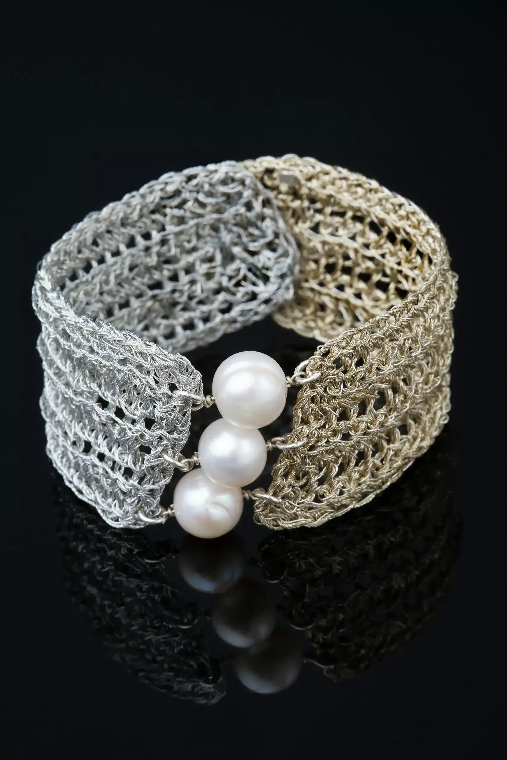 Crochet knit silver bracelet with golden threads and pearls