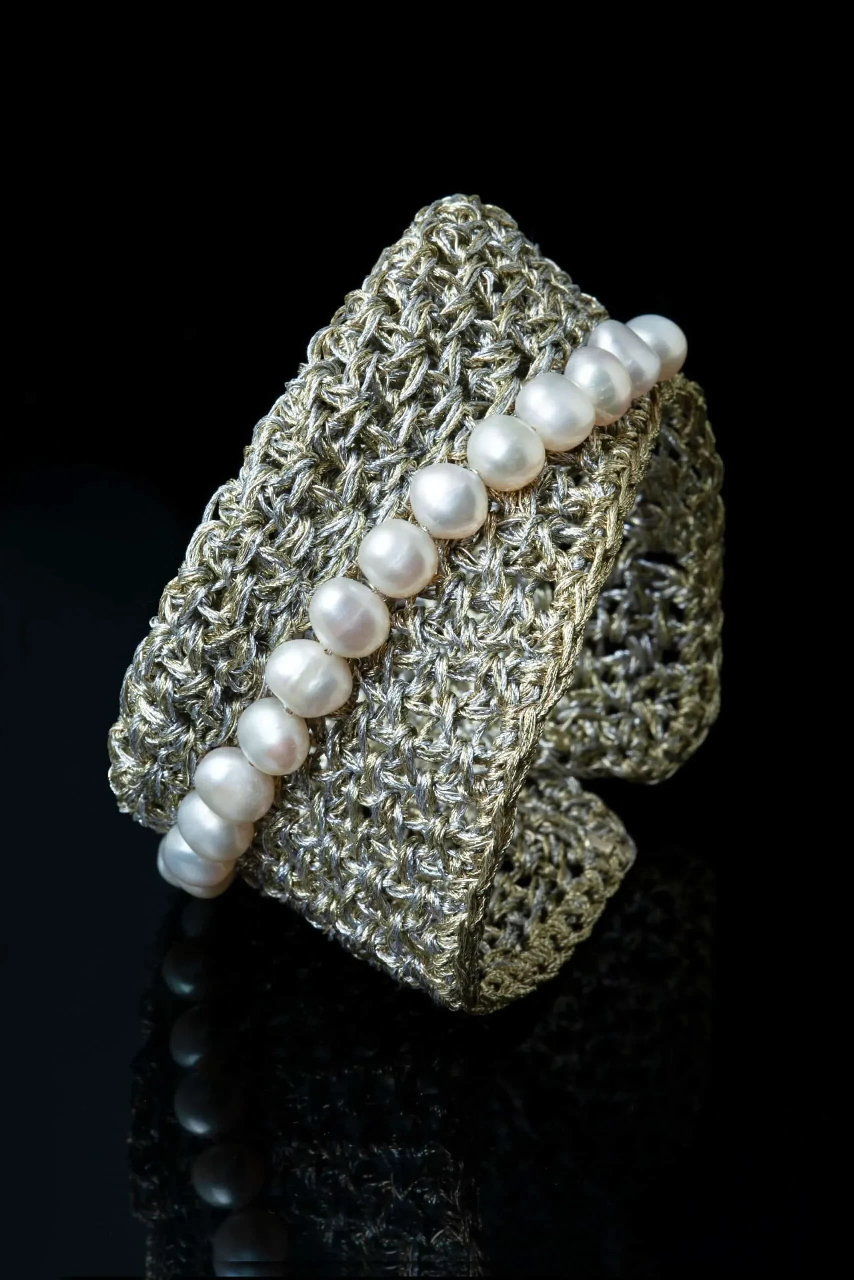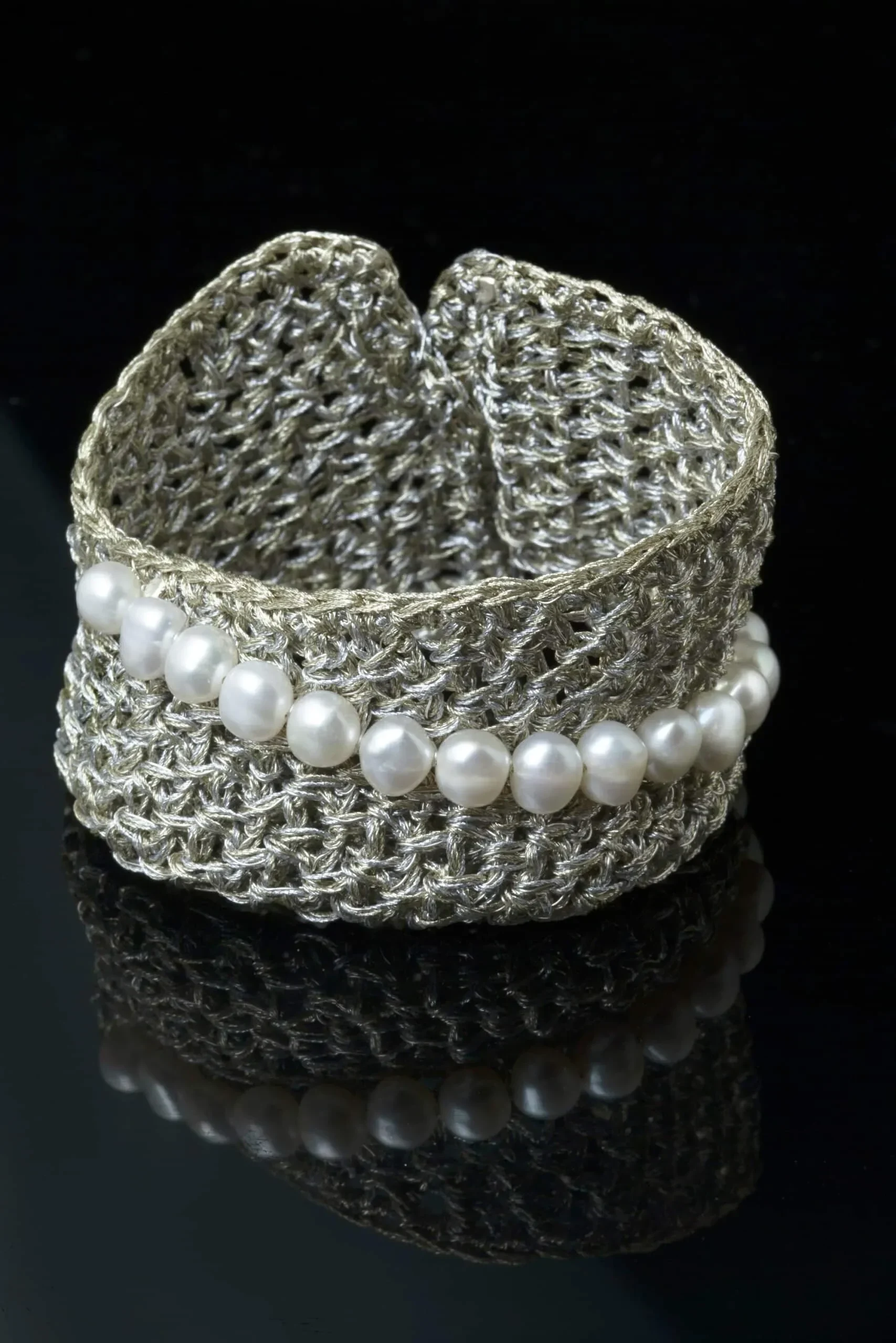 Crochet knit silver bracelet with pearls