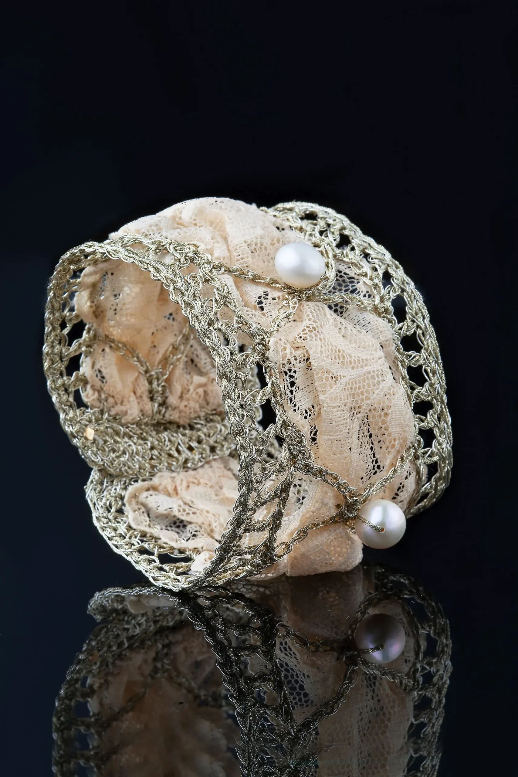 Introducing our stunning crochet knit silver bracelet with pearls and lace! Handcrafted with precision and care, this exquisite piece is a must-have for every jewellery lover. The intricate crochet design adds a touch of elegance, while the delicate pearls and lace detailing bring a vintage charm. Made with high-quality silver, this bracelet is hypoallergenic and perfect for daily wear. With its adjustable size, it fits comfortably on any wrist. Add a touch of sophistication to any outfit with this timeless accessory. Get yours today!