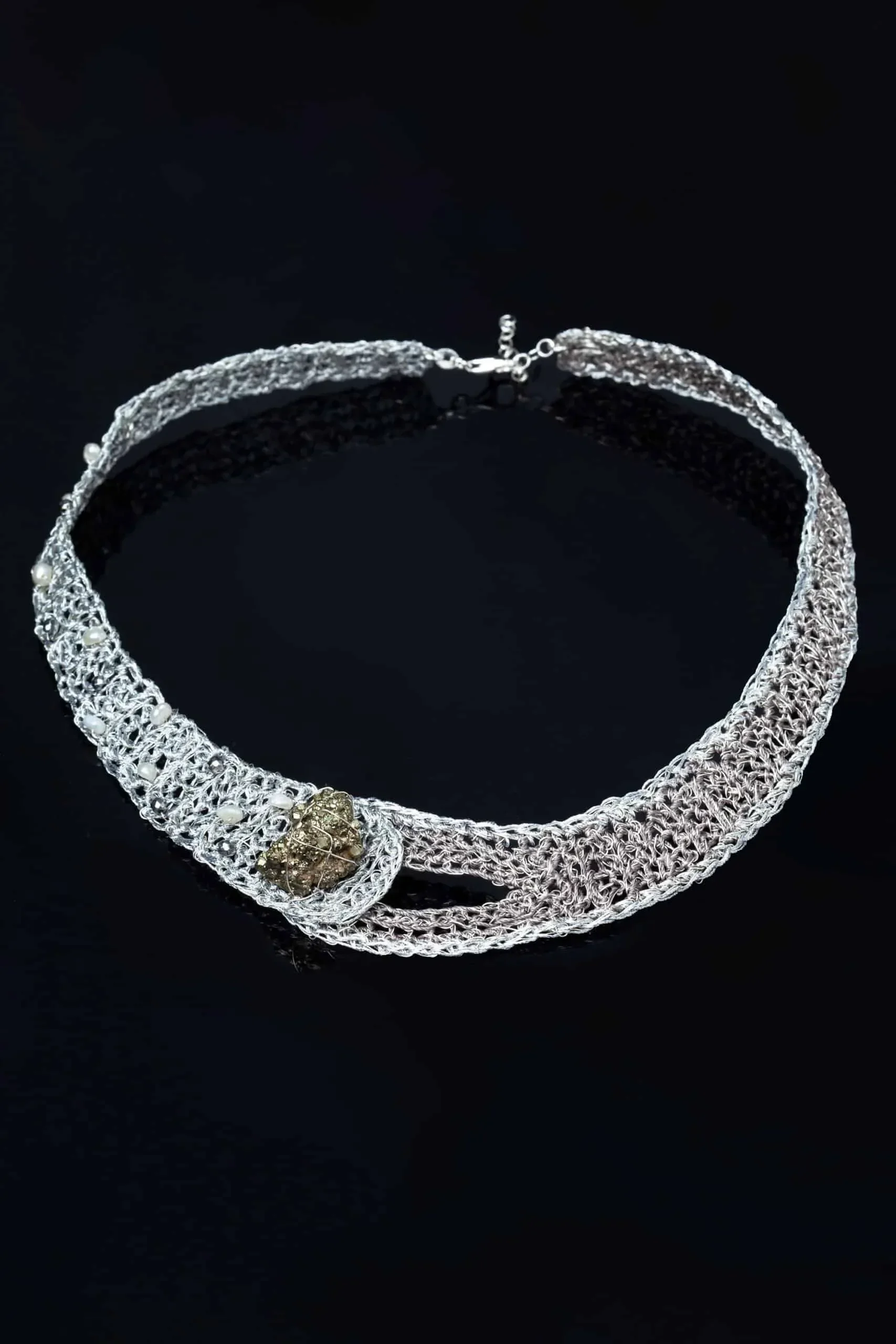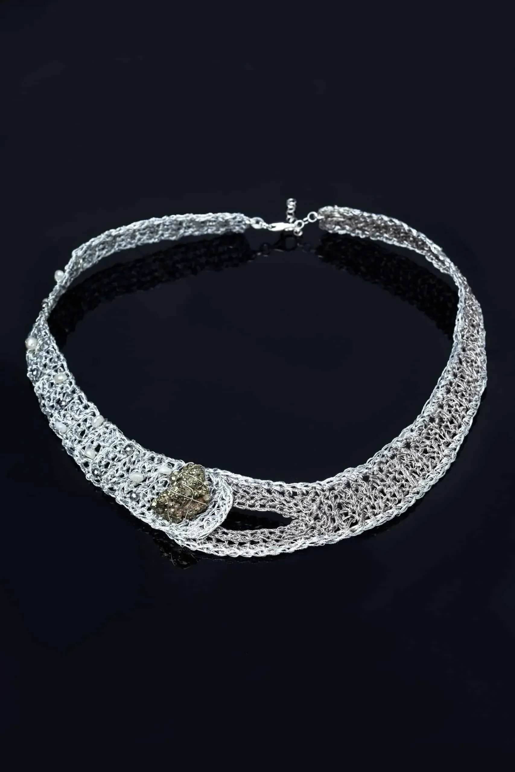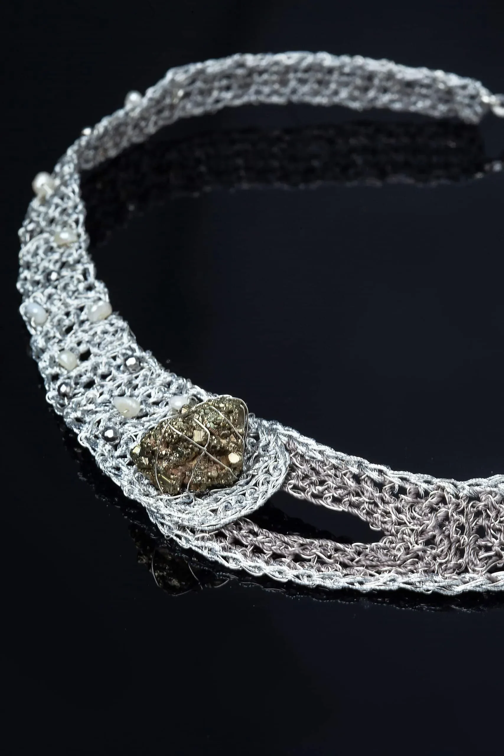 Crochet knit silver necklace with black threads, pearls and pyrite