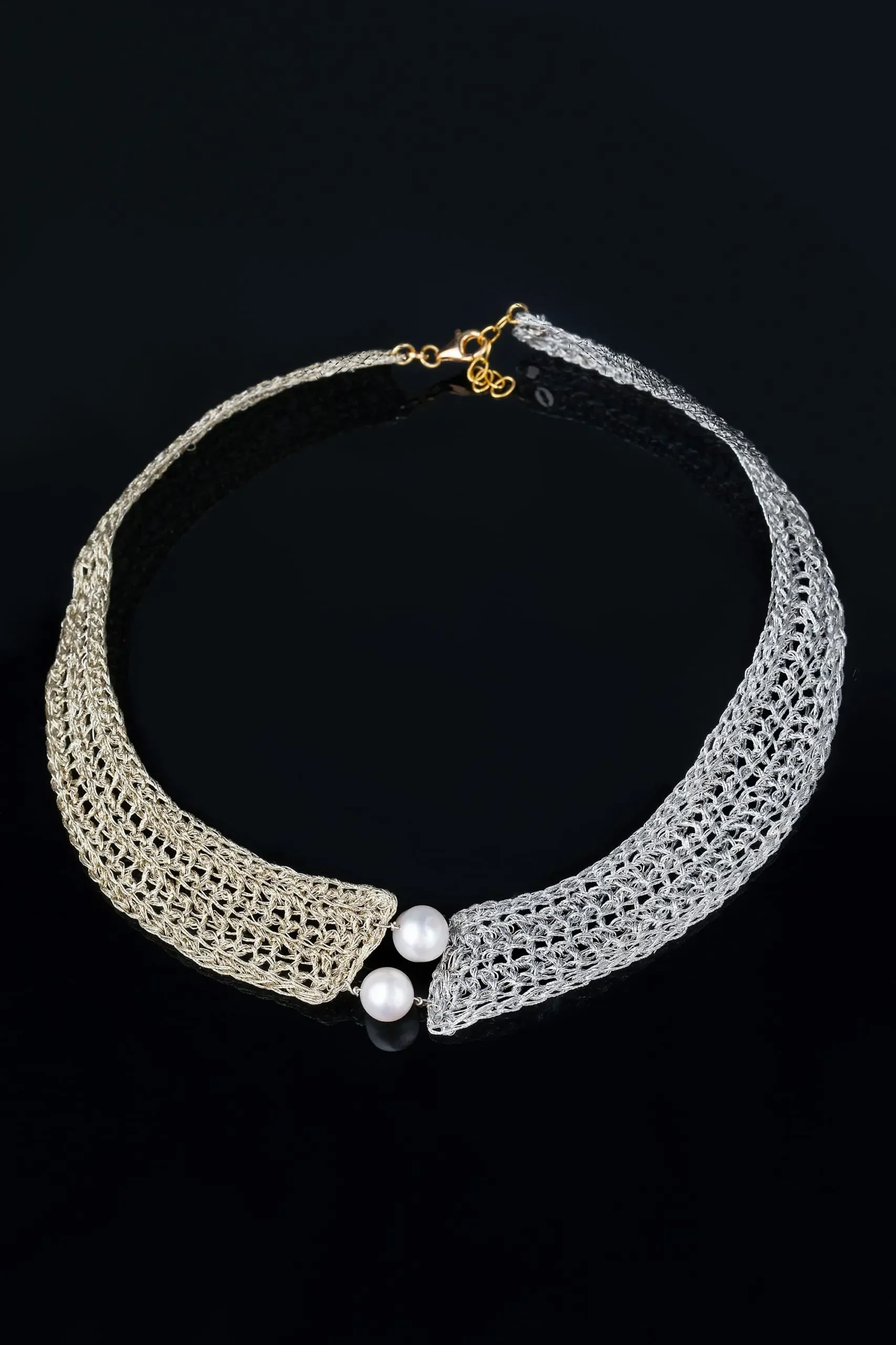 Crochet knit silver necklace with and pearls