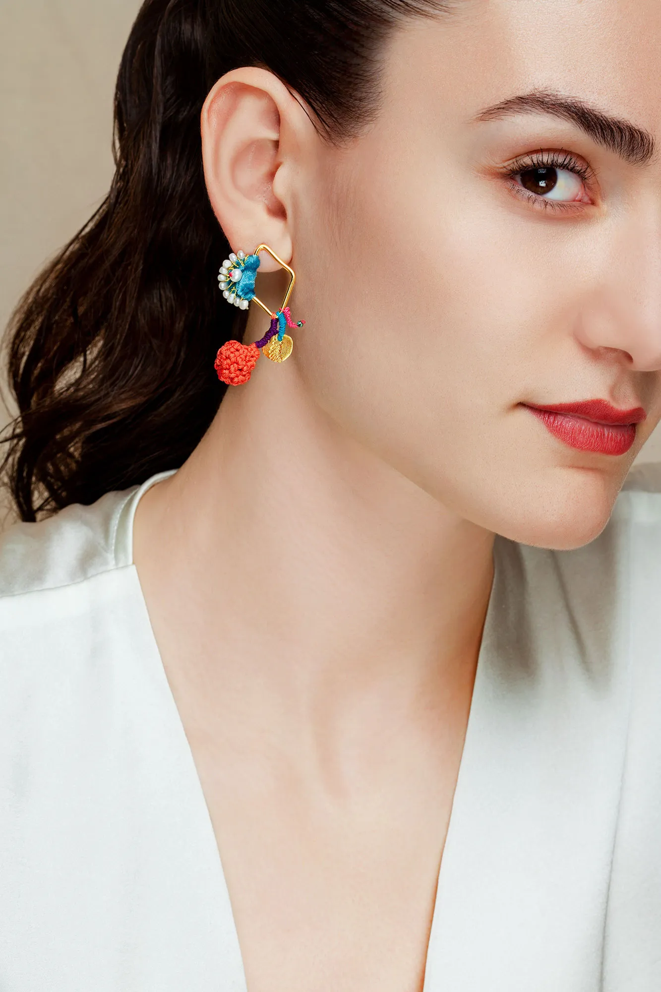 Diamond shaped gold plated silver earrings with fabrics and pearls