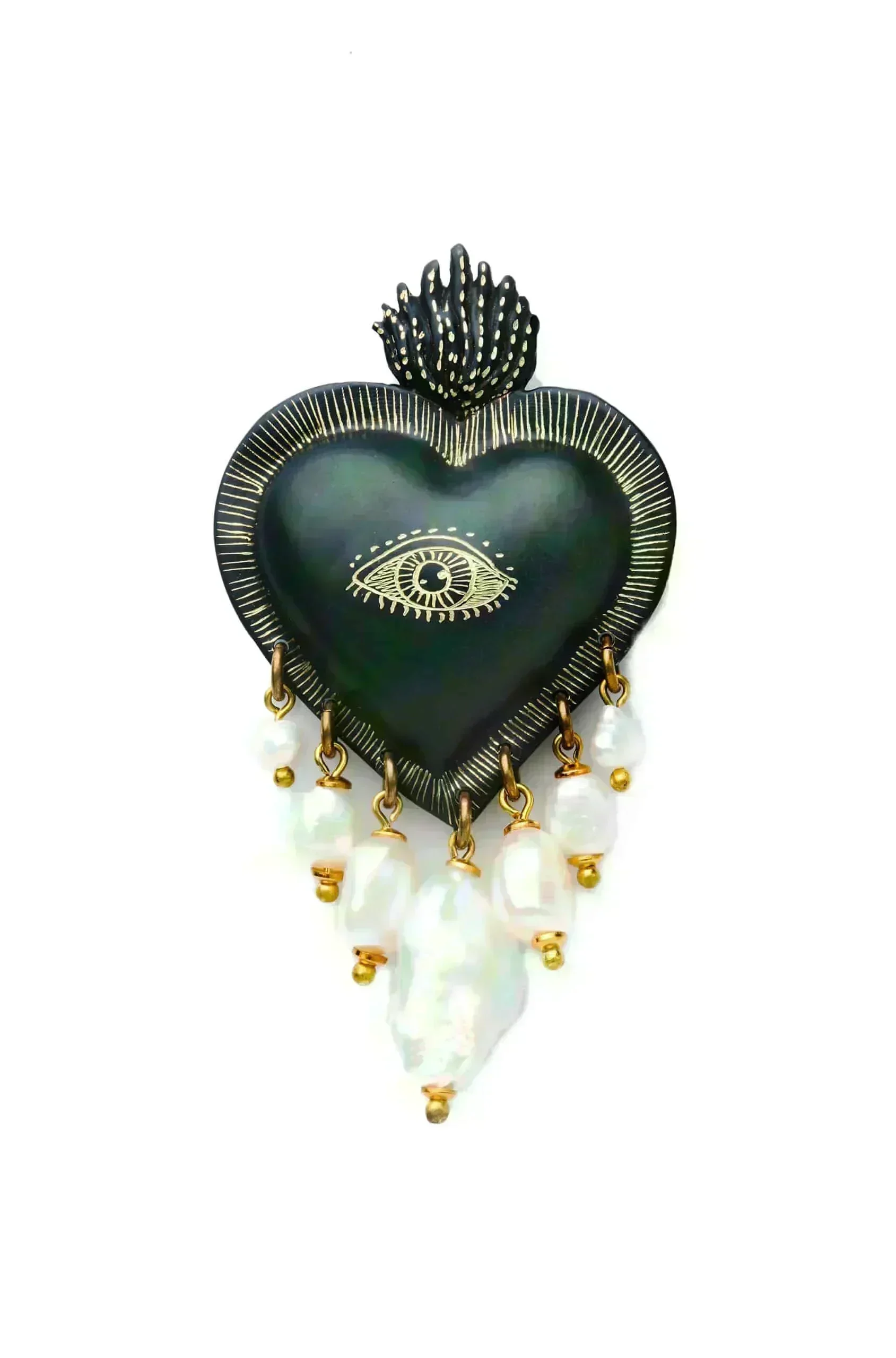Engraved heart bronze brooch, black rhodium plated combined with pearls