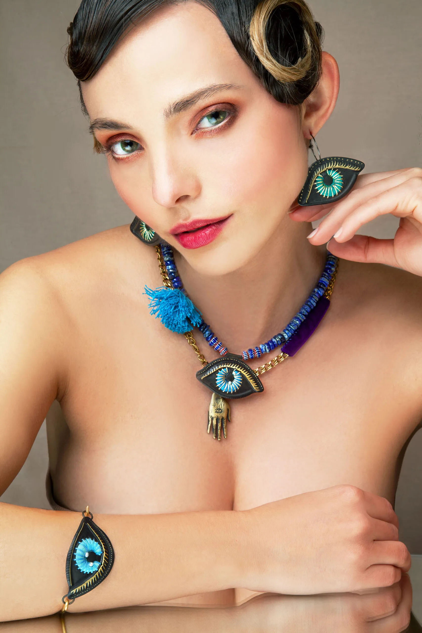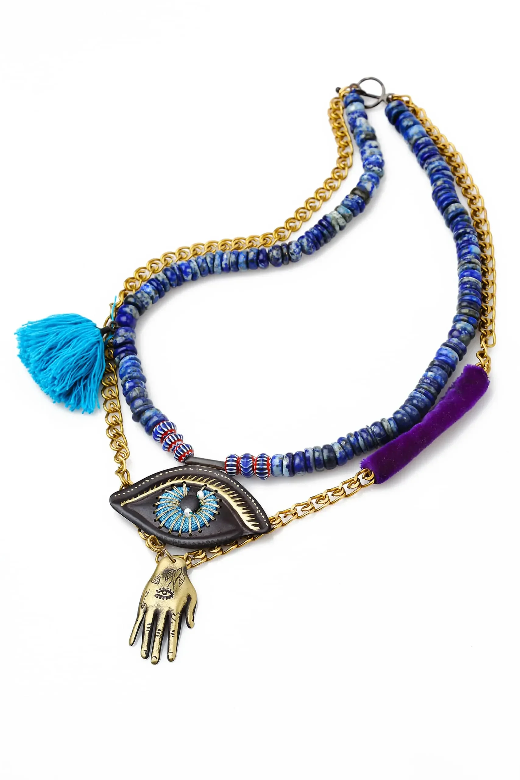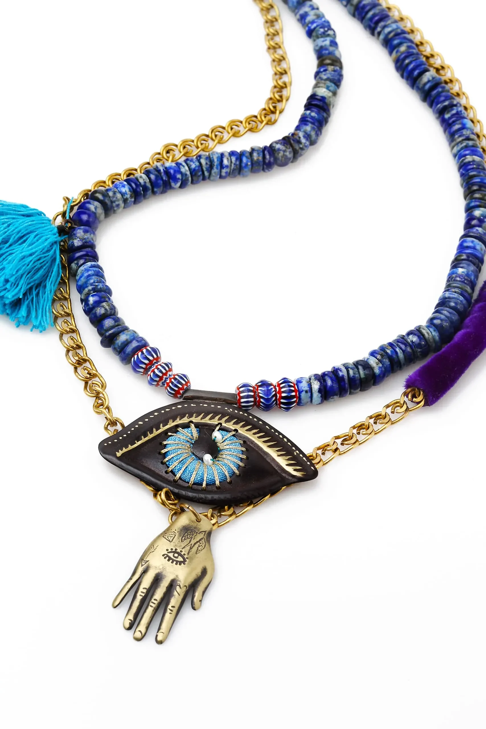 Eye engraved bronze necklace with lapis lazuli, handmade glass beads and fabrics