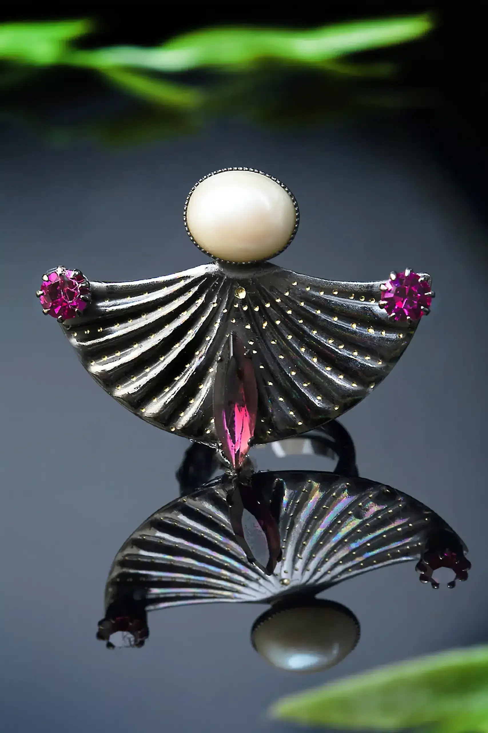 Fan engraved adjustable bronze ring with Swarovski crystals and pearl