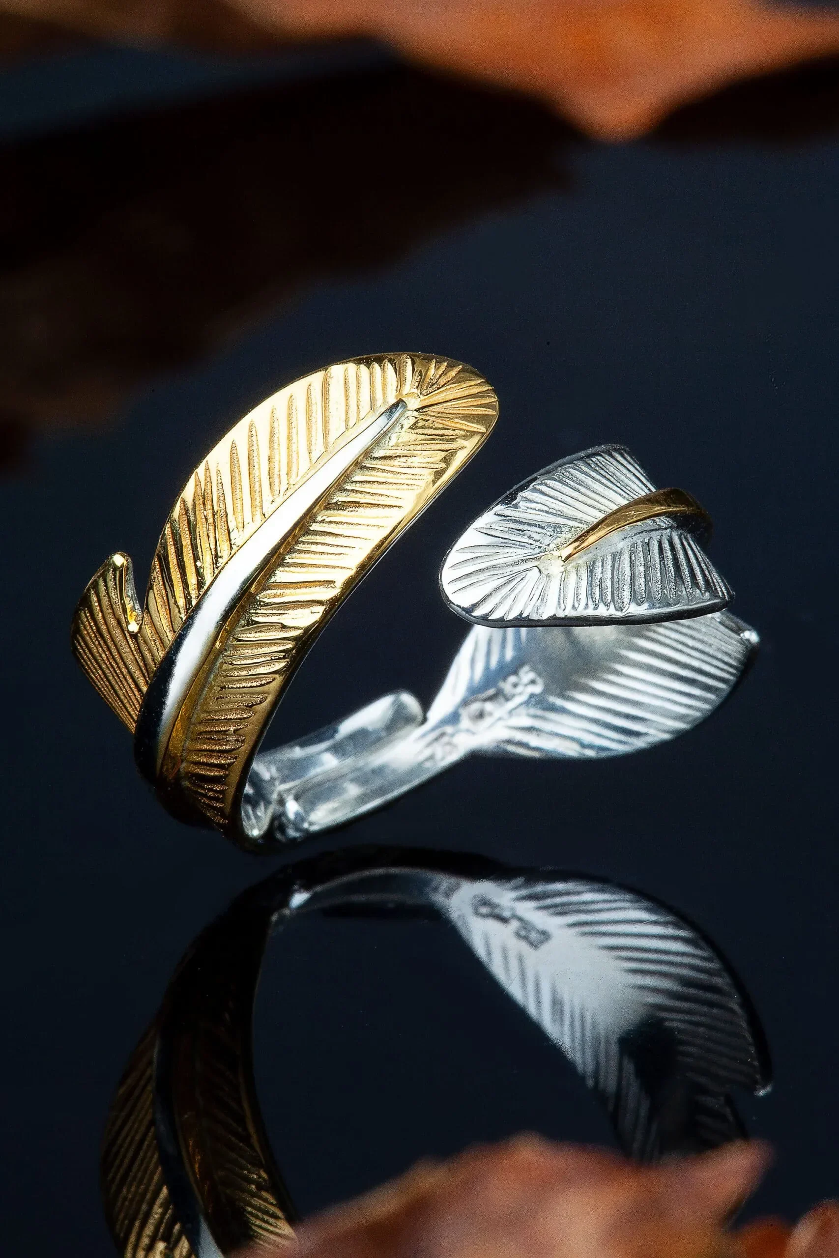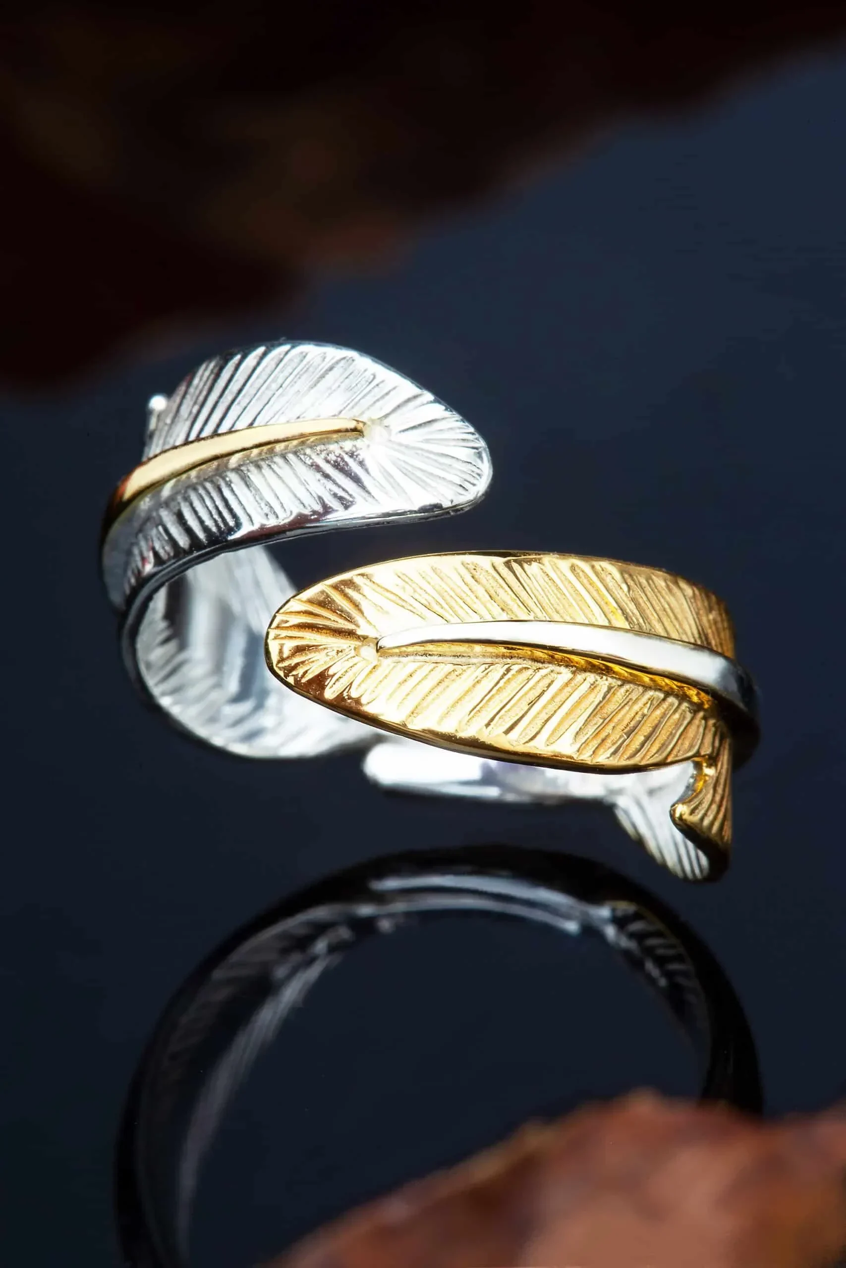Introducing our stunning Feather handmade textured silver ring, plated in both gold and rhodium for a luxurious and unique look. Each ring is meticulously crafted by hand, making it a one-of-a-kind piece that will elevate any outfit. The intricate feather texture adds a touch of whimsy, and the combination of gold and rhodium plating ensures durability and a timeless shine. Perfect for those who appreciate fine craftsmanship and want to make a statement with their jewellery. Shop now and add this exquisite ring to your collection.