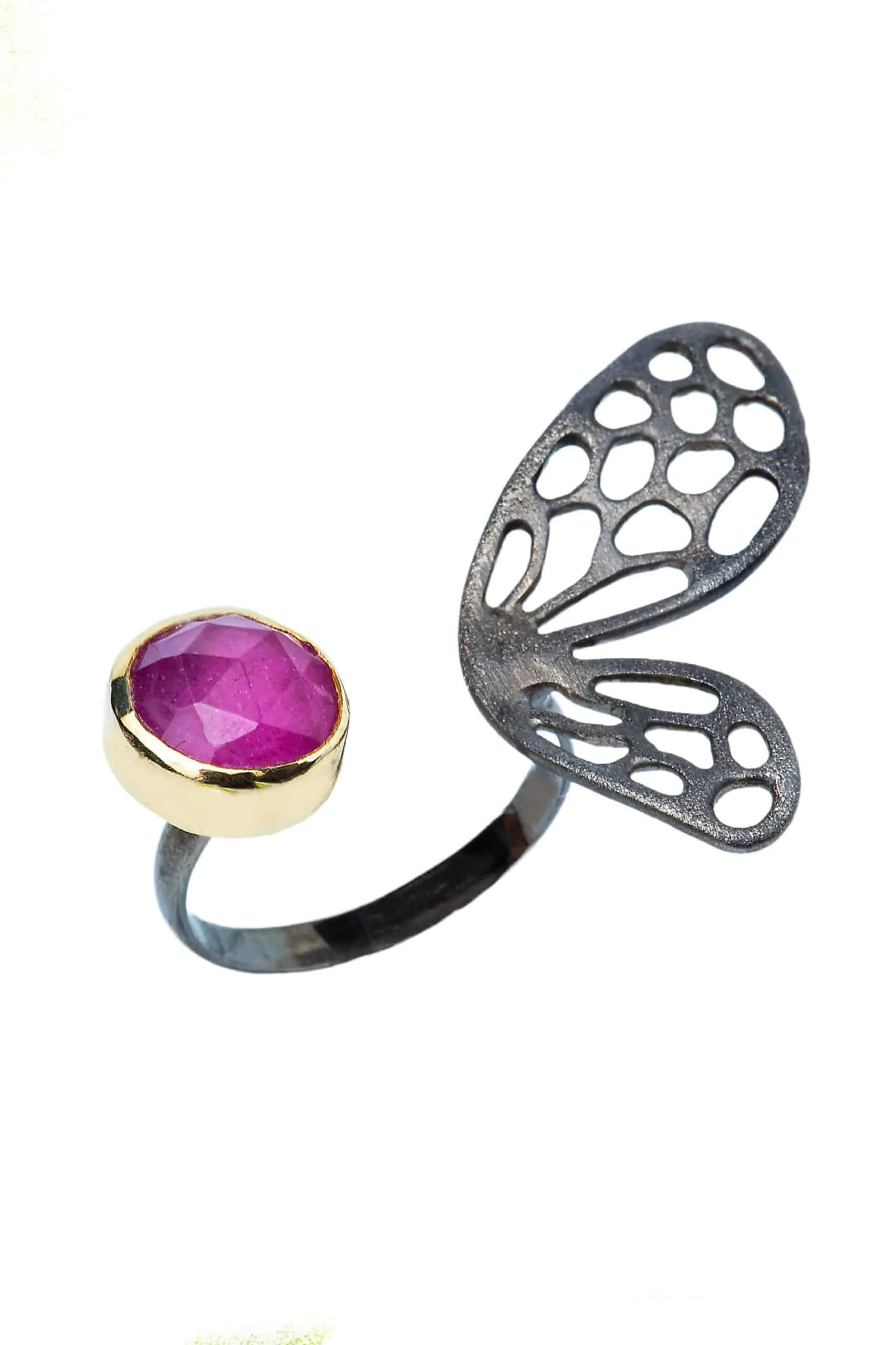 Butterfly black rhodium plated 925 silver ring combined with ruby and quartz