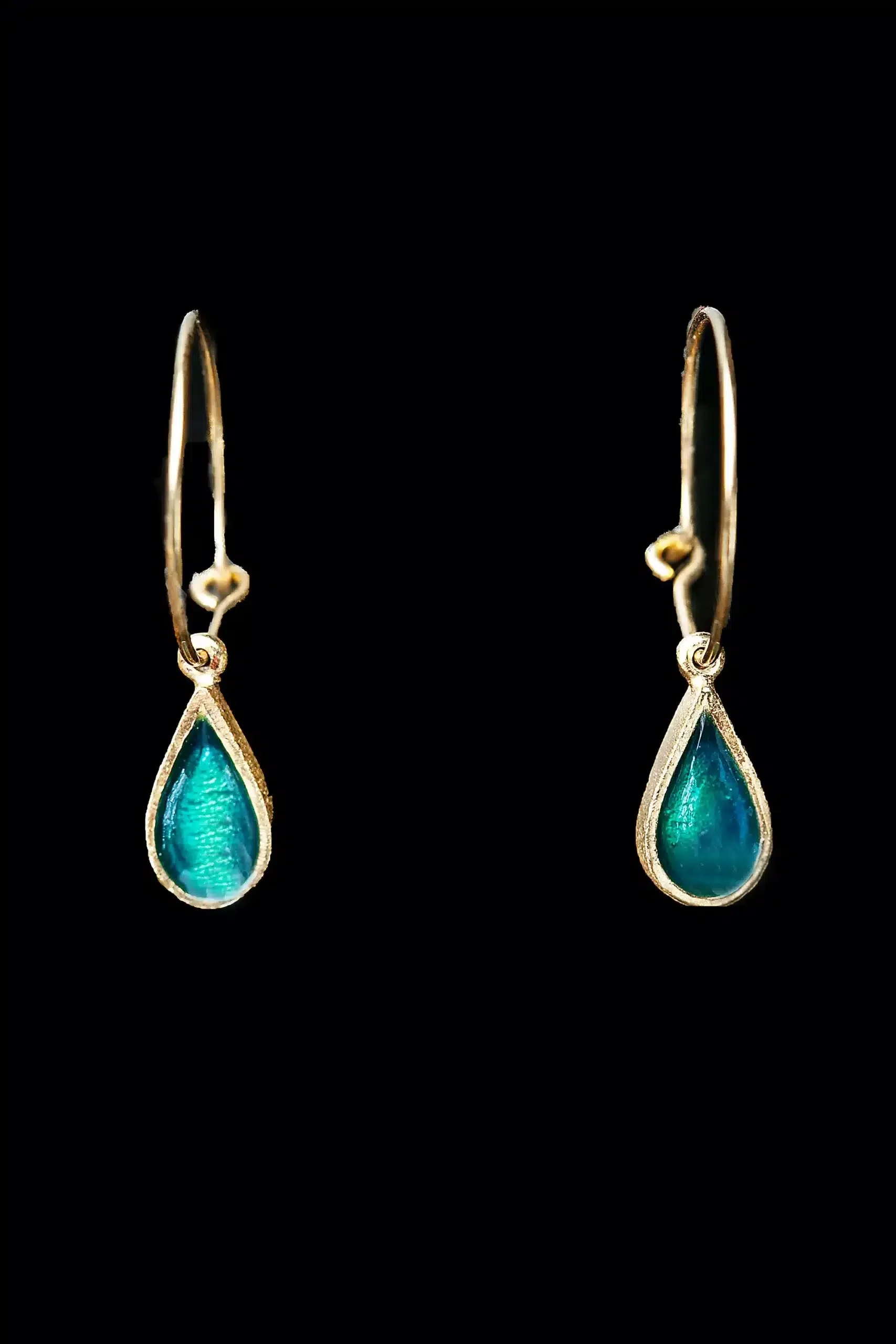 Drops gold plated silver hoops with green enamel