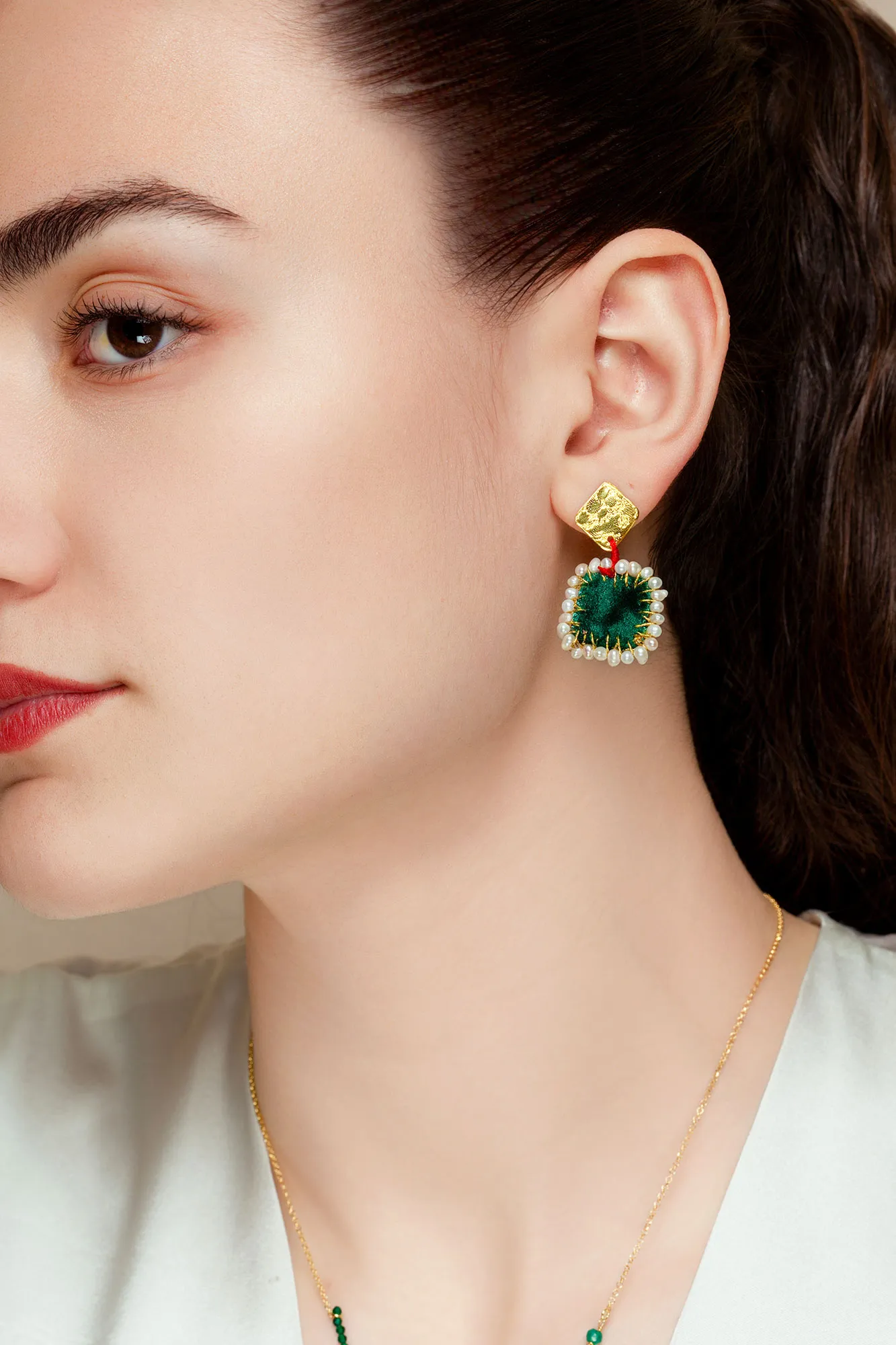 Textured gold plated silver earrings with green velvet and pearls