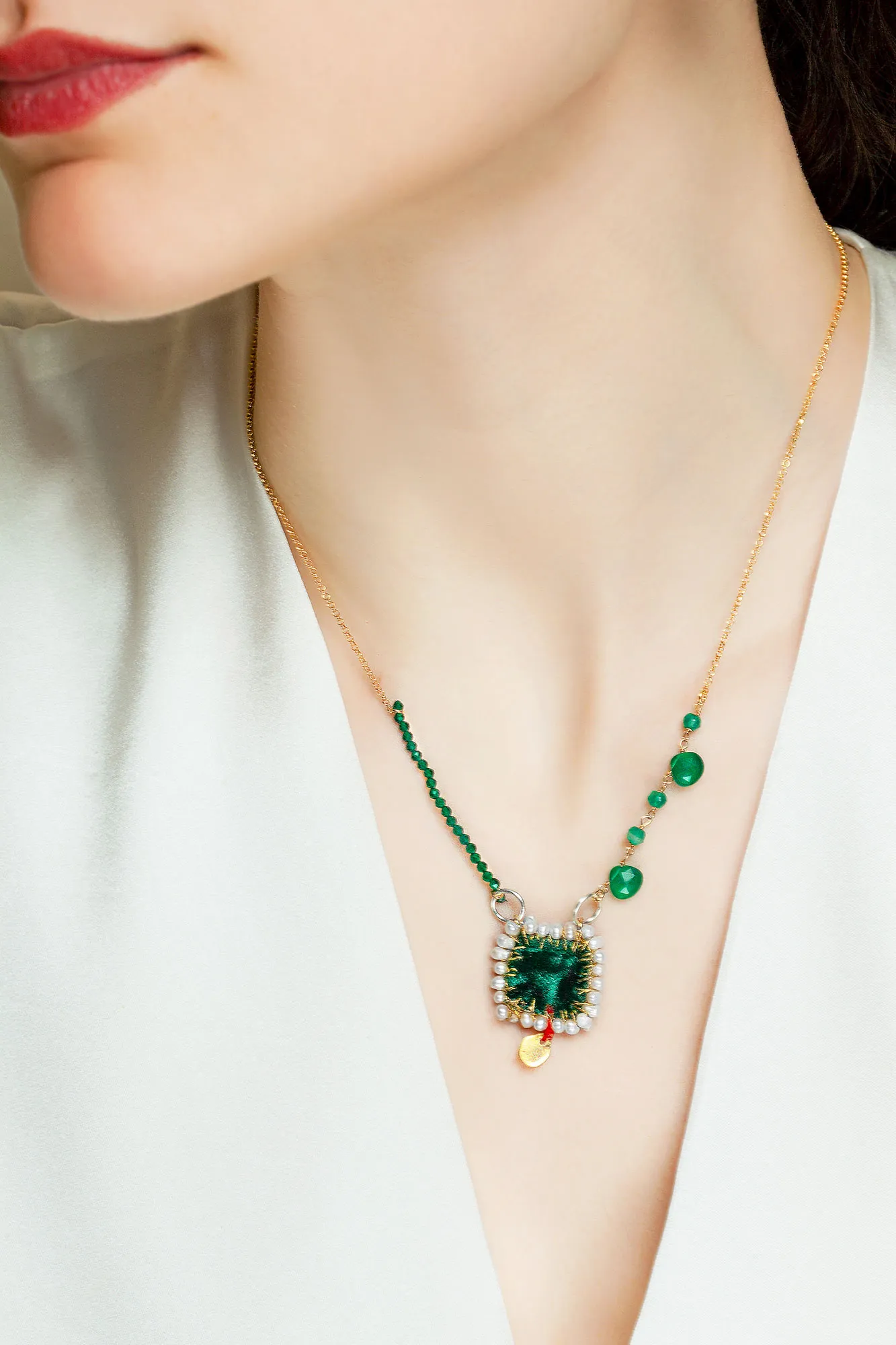 Introducing our stunning Gold Plated Silver Necklace, adorned with luxurious velvet, lustrous pearls and mesmerizing green agate. This enchanting piece is crafted with precision and features a delicate chain, plated in shimmering gold for a touch of elegance. Each pearl and agate stone is carefully handpicked, adding a unique touch to every necklace. Elevate any outfit with this versatile piece, perfect for a night out or a special occasion. With its timeless design and high-quality materials, this necklace makes for a perfect gift for yourself or a loved one. Order now and add a touch of sophistication to your jewellery collection.