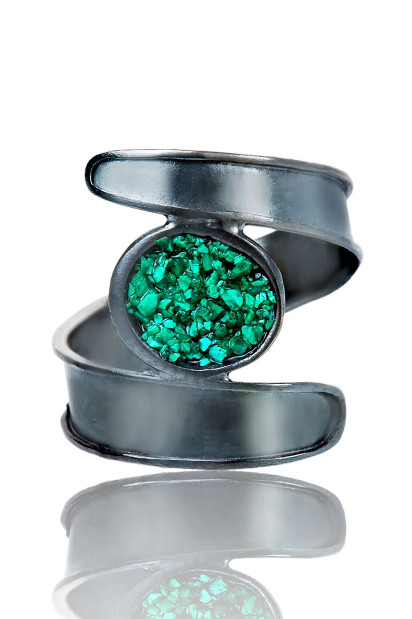 A bold and unique handcrafted ring that demands attention. Its structured, architectural form in deep black oxidized 925 silver wraps elegantly around the finger. At its heart, a circular setting filled with crushed malachite creates a dazzling green texture inspired by nature’s raw beauty. A modern statement piece designed for those who appreciate powerful contrasts and artistic craftsmanship.