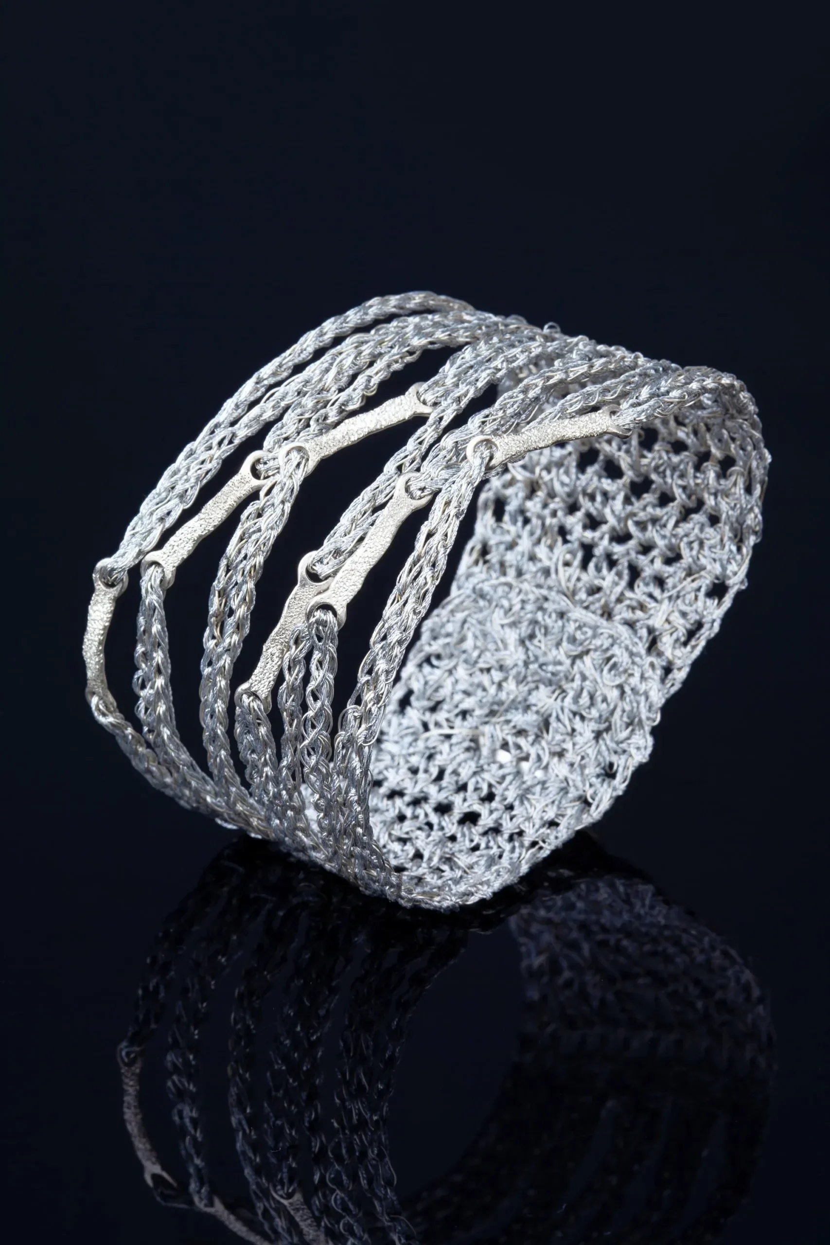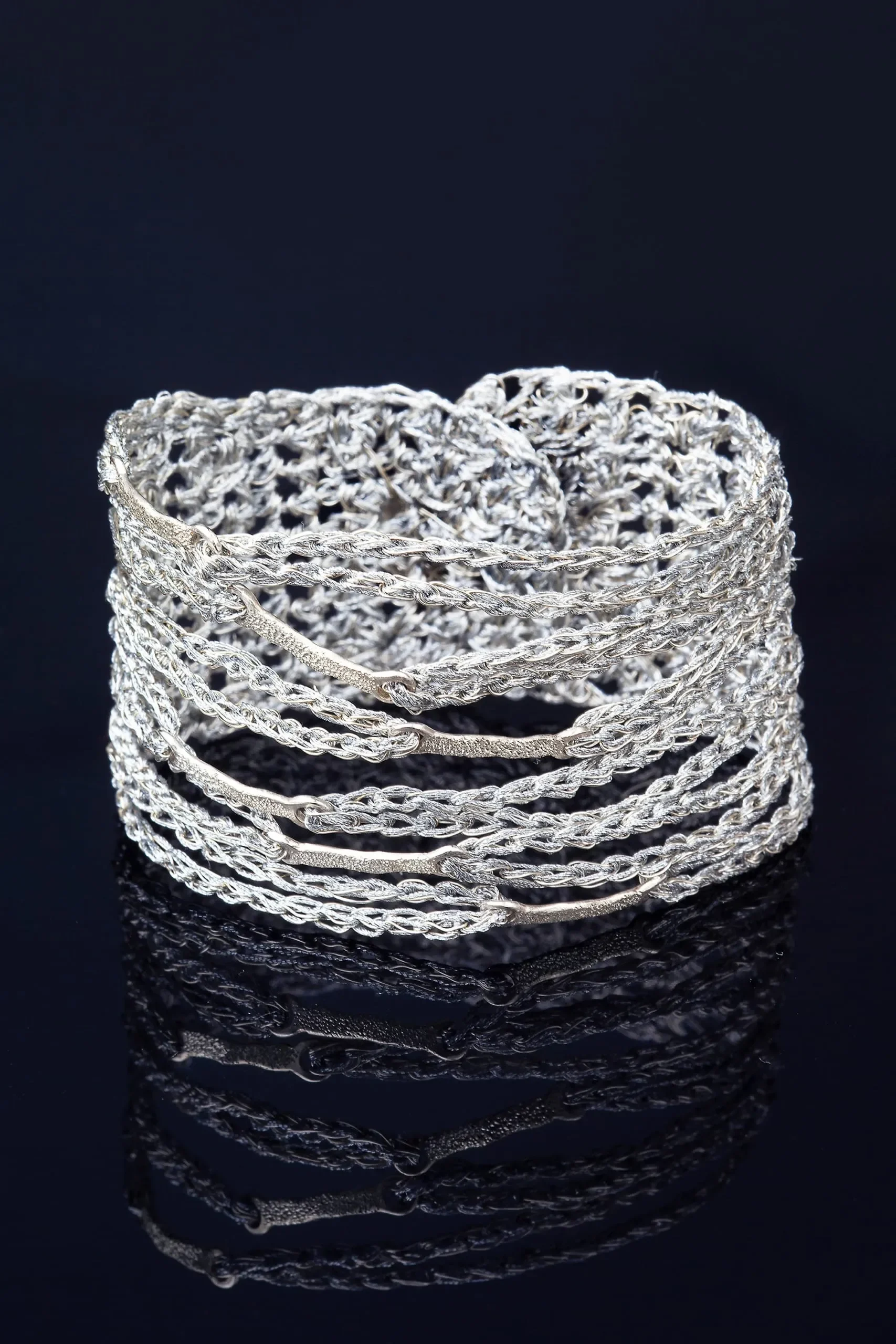 Our Crochet Knit Silver Bracelet is a unique piece that will make you stand out from the crowd. Its intricate details and high-quality materials make it a statement piece that will elevate any outfit. It is also easy to mix and match with other jewellery, making it a versatile addition to your collection.