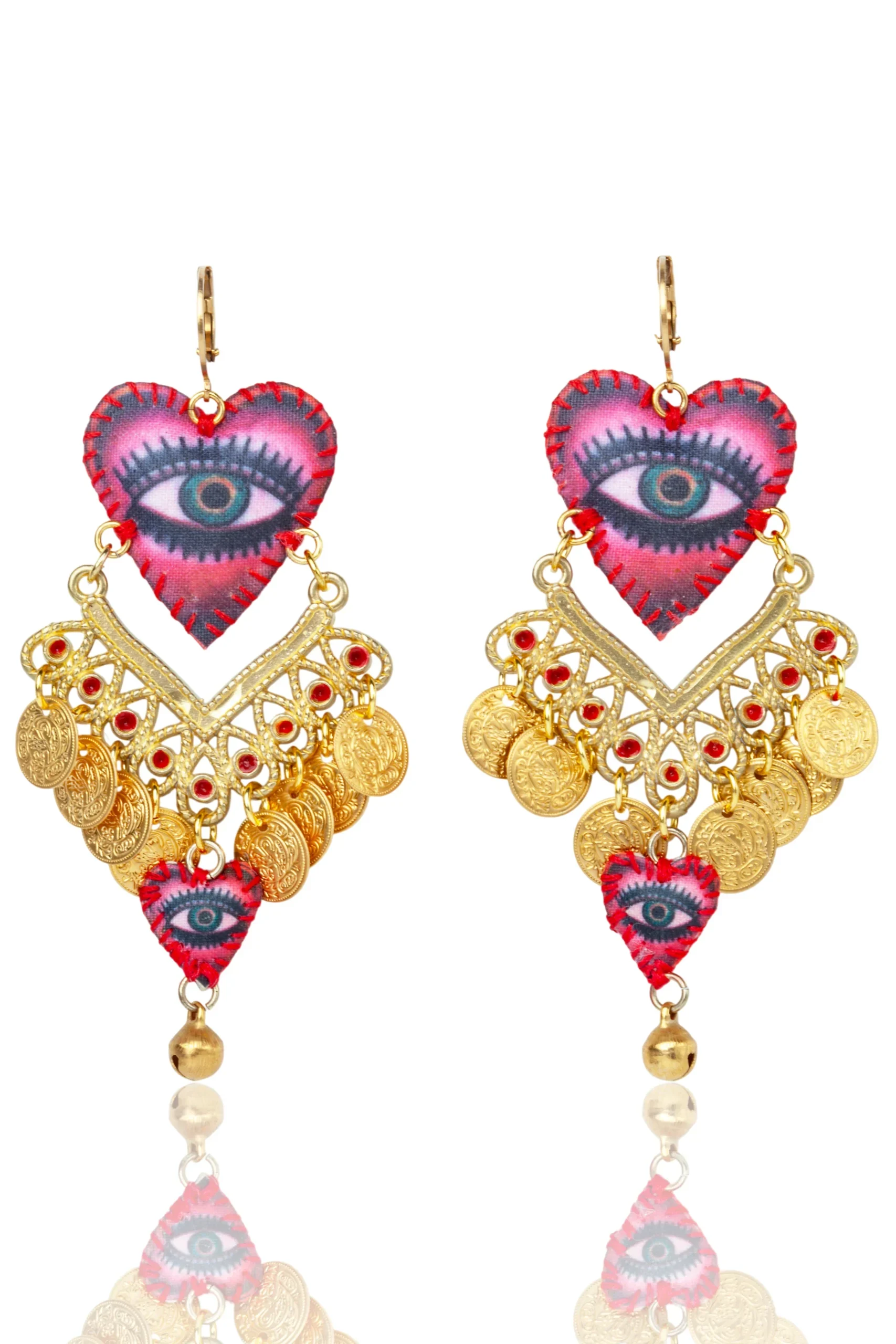 The Sacred Heart: Each earring features a heart pendant intricately embroidered in a vibrant palette of red and pink. Centred by a striking blue and white “Gazing Eye” motif.