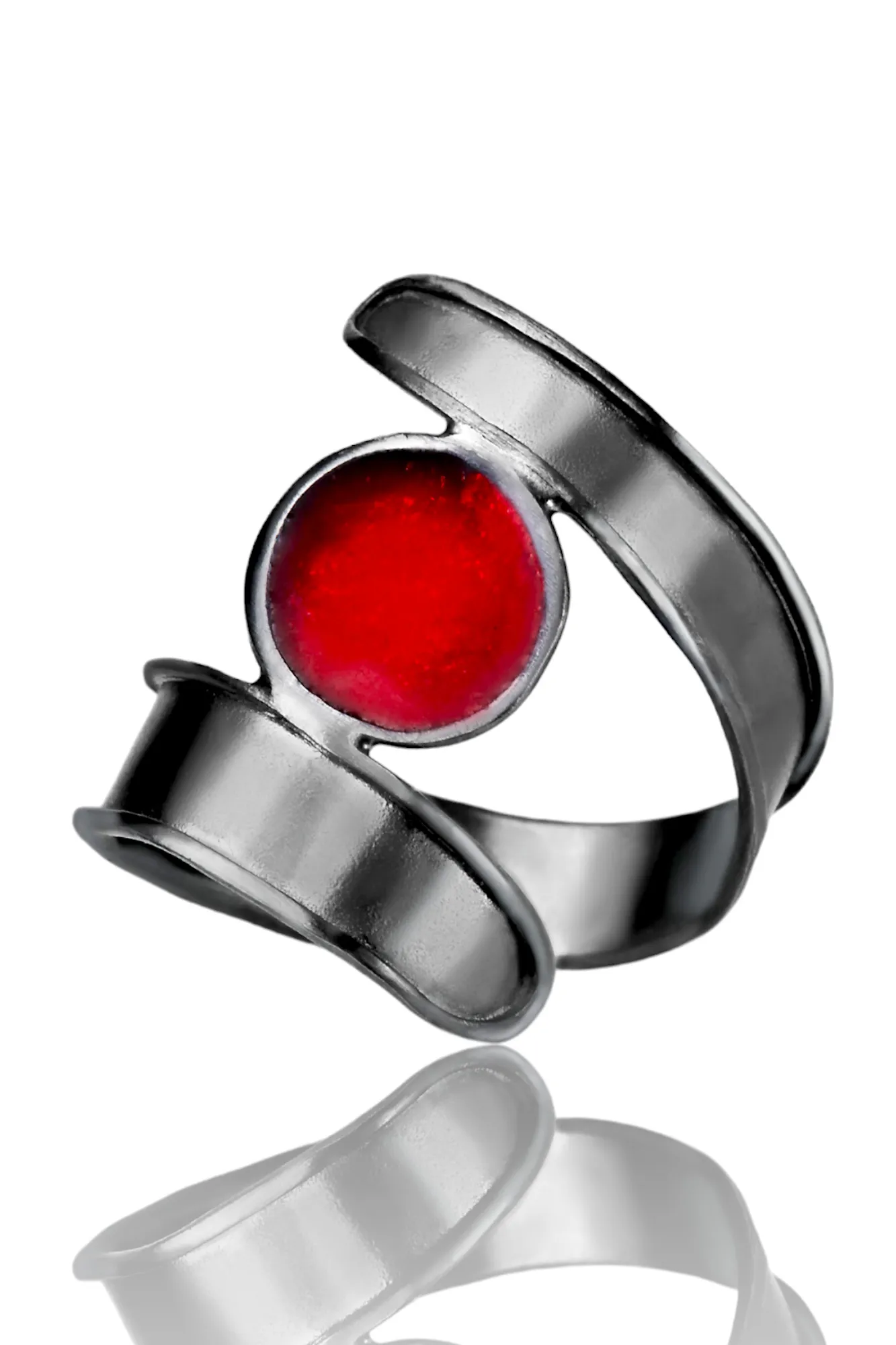 Handmade silver black ring with red enamel
