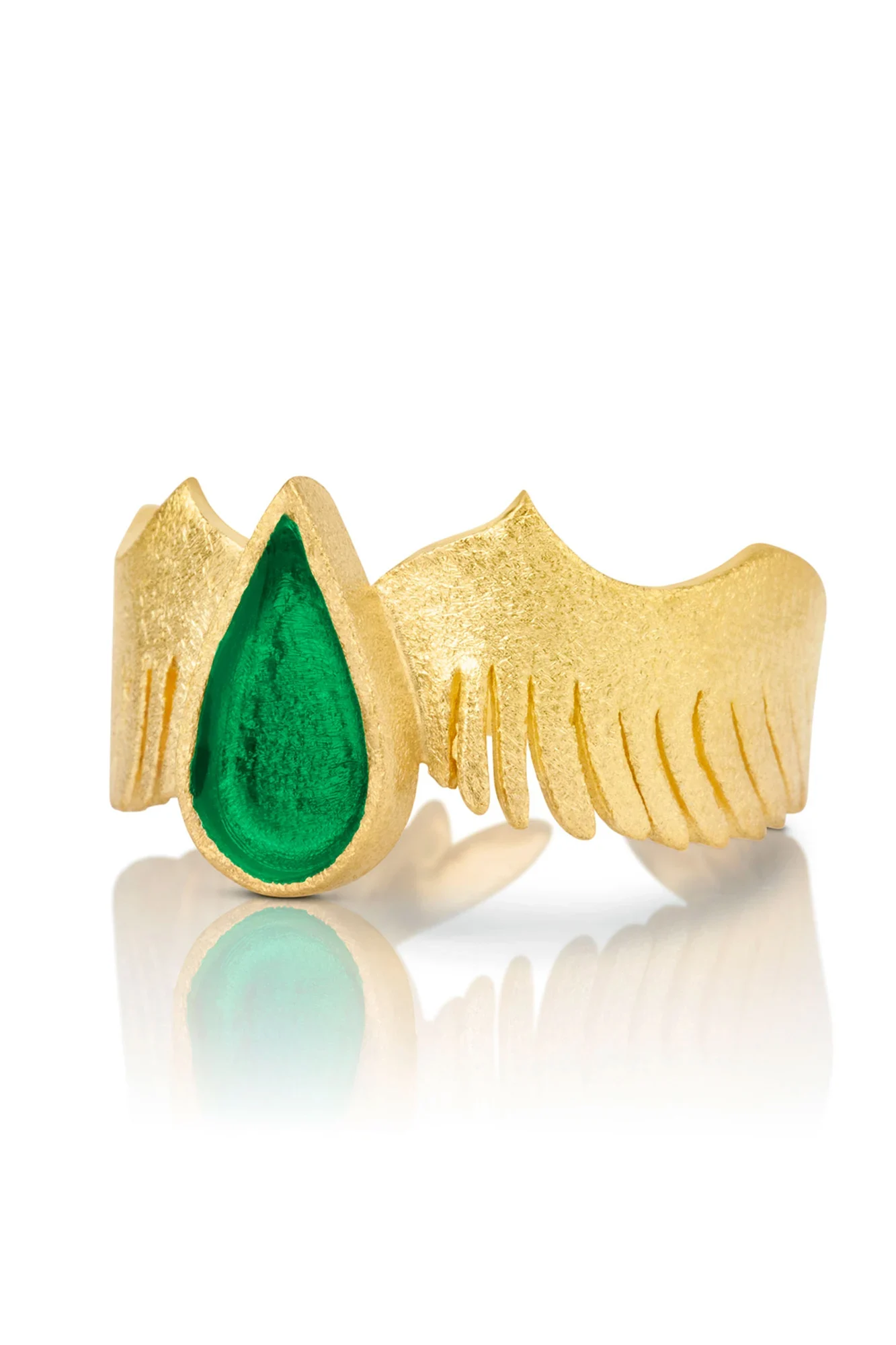 Introducing our stunning Handmade Wings Gold Plated Silver Adjustable Ring, featuring a centre drop shaped element with vibrant green enamel. This one-of-a-kind piece is meticulously crafted by skilled artisans, making it truly unique and special. The gold plating adds a touch of elegance and luxury, while the green enamel adds a pop of colour. Perfect for any occasion, this ring is sure to turn heads and make a statement. Shop now and elevate your jewellery collection with our Handmade Wings Gold Plated Silver Adjustable Ring.
