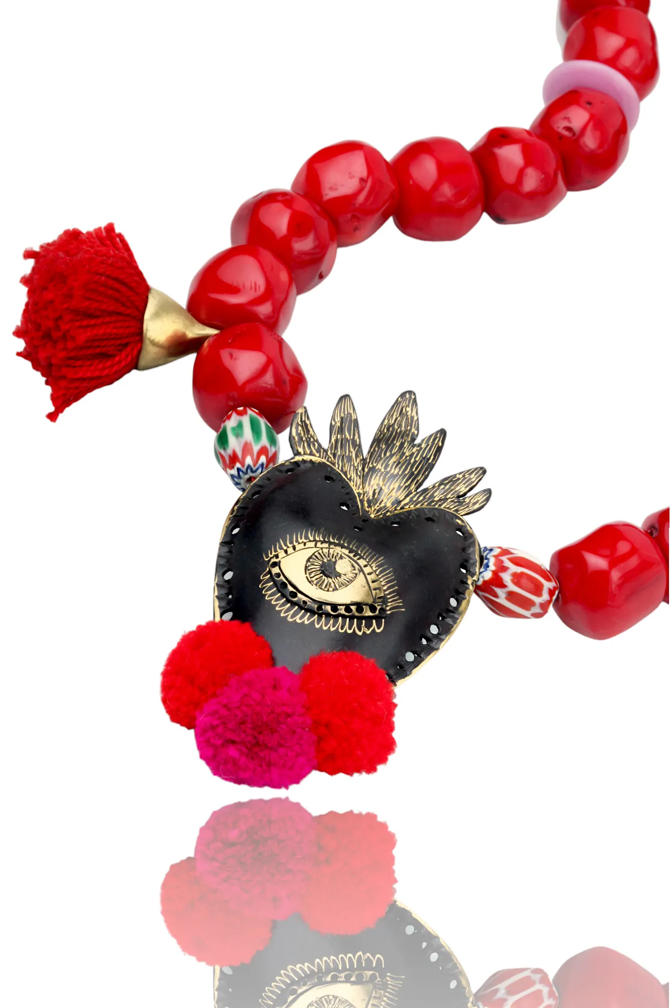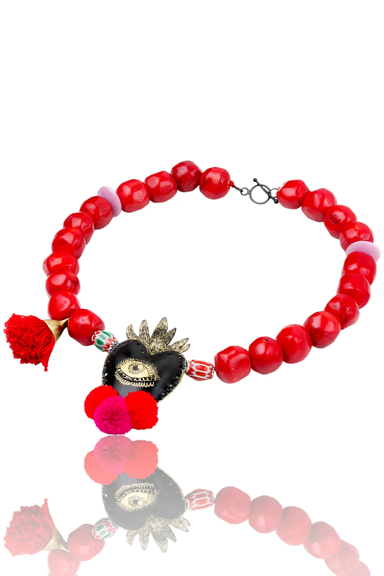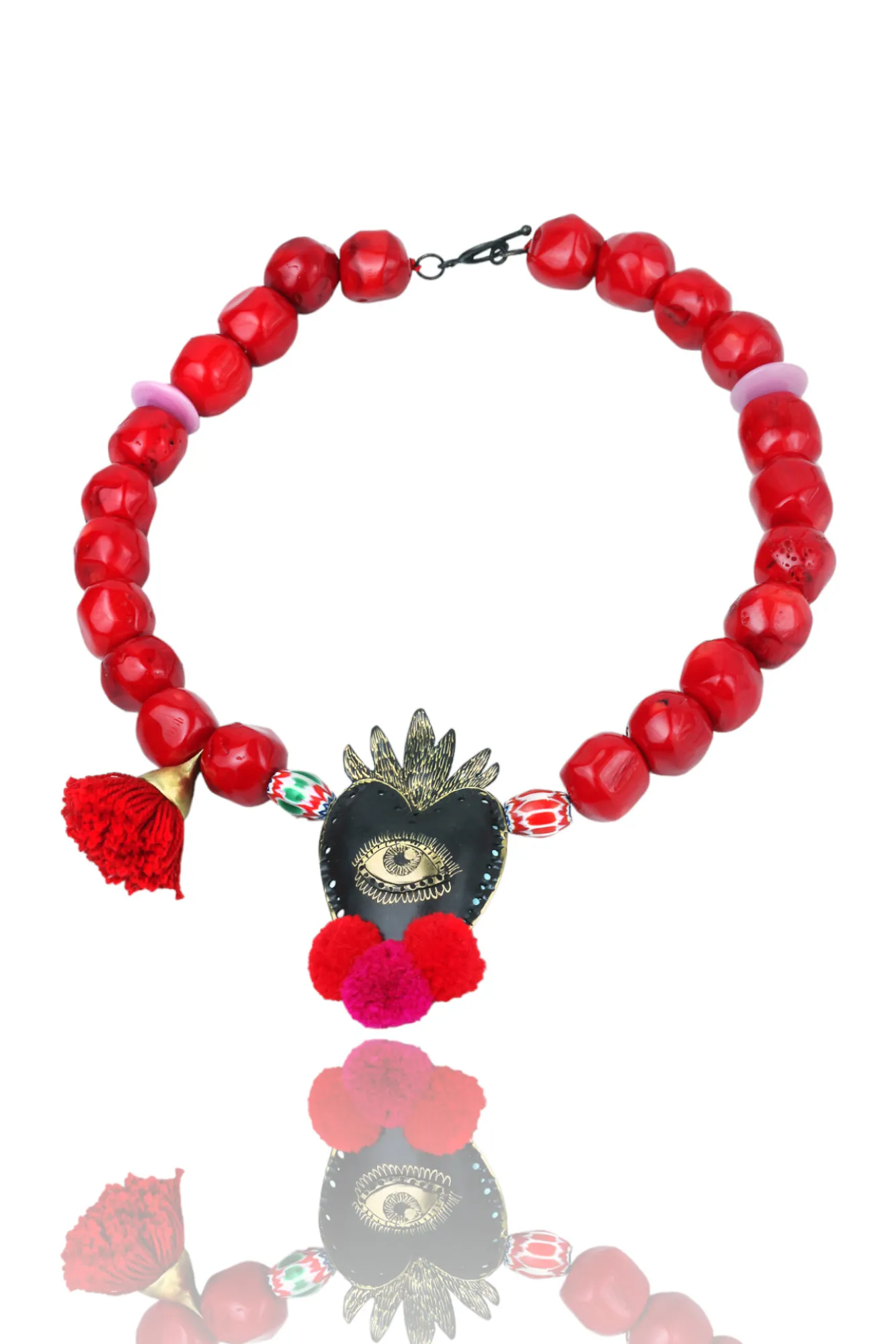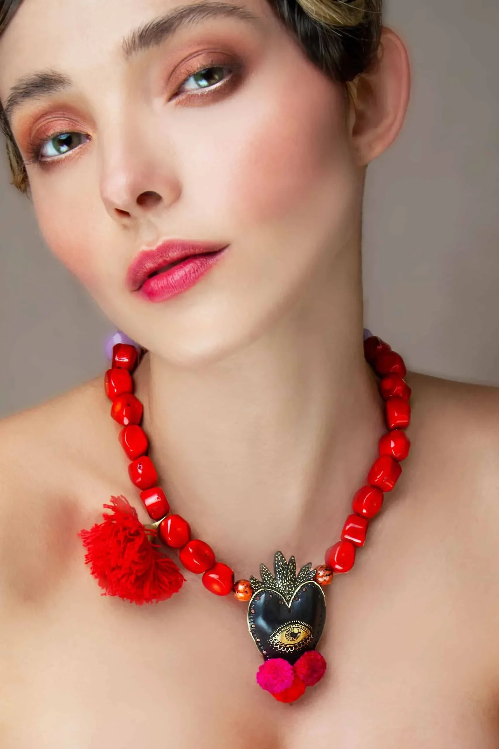 Introducing our stunning Heart Engraved Bronze Necklace with Corals and pompoms. A must-have accessory for any fashion-forward individual! Crafted from high-quality bronze, this necklace features a delicate heart-shaped pendant with intricate engravings, adding a touch of elegance and charm. Adorned with vibrant coral beads and playful pompoms, this necklace is a true statement piece that will add a pop of colour and personality to any outfit. Whether you’re dressing up for a special occasion or adding a touch of whimsy to your everyday look. This necklace is the perfect choice. Don’t miss out on owning this unique and eye-catching necklace that will surely turn heads and elevate your jewellery game. Shop now and add a touch of love and playfulness to your jewellery collection!