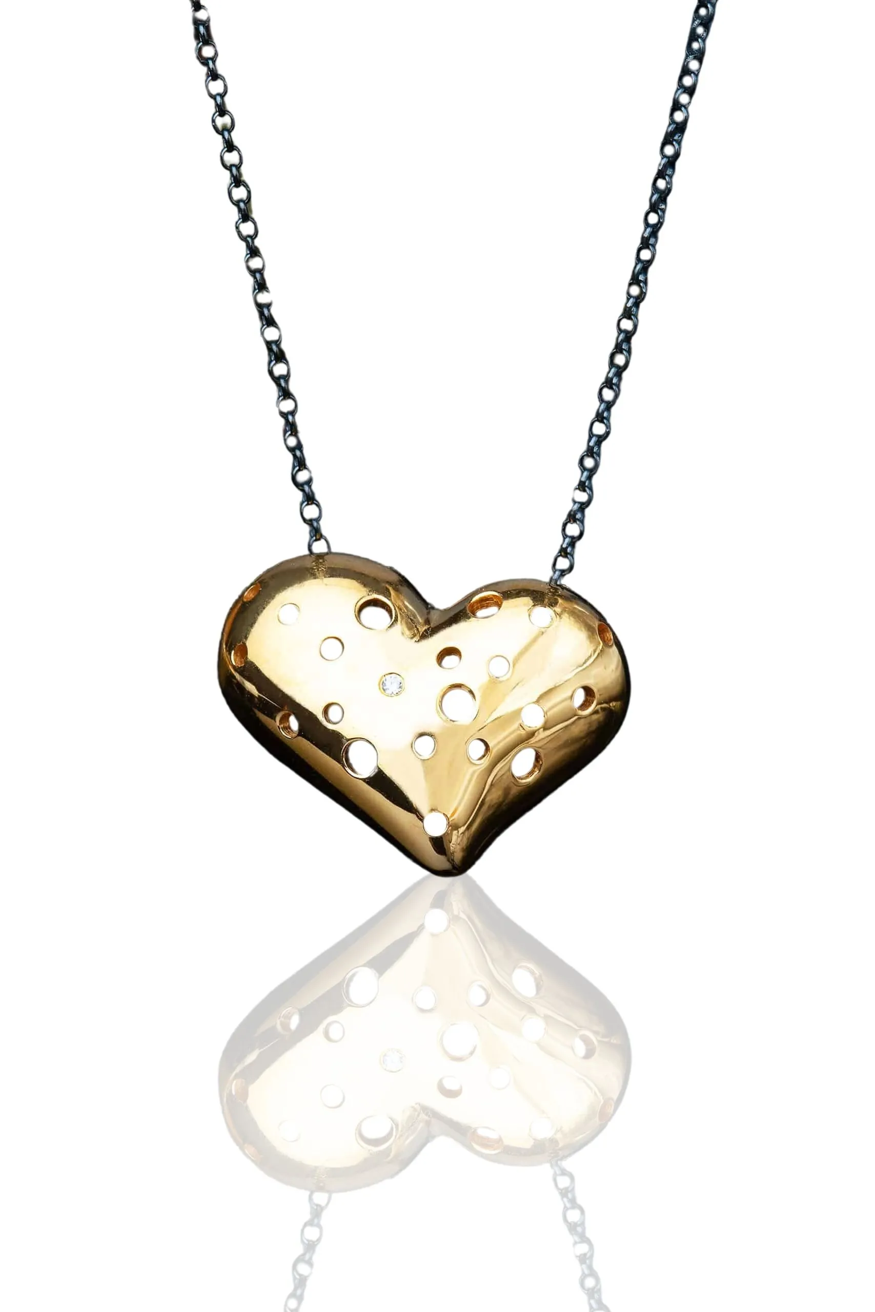 Heart gold plated silver necklace with zircon and black rhodium plated silver chain