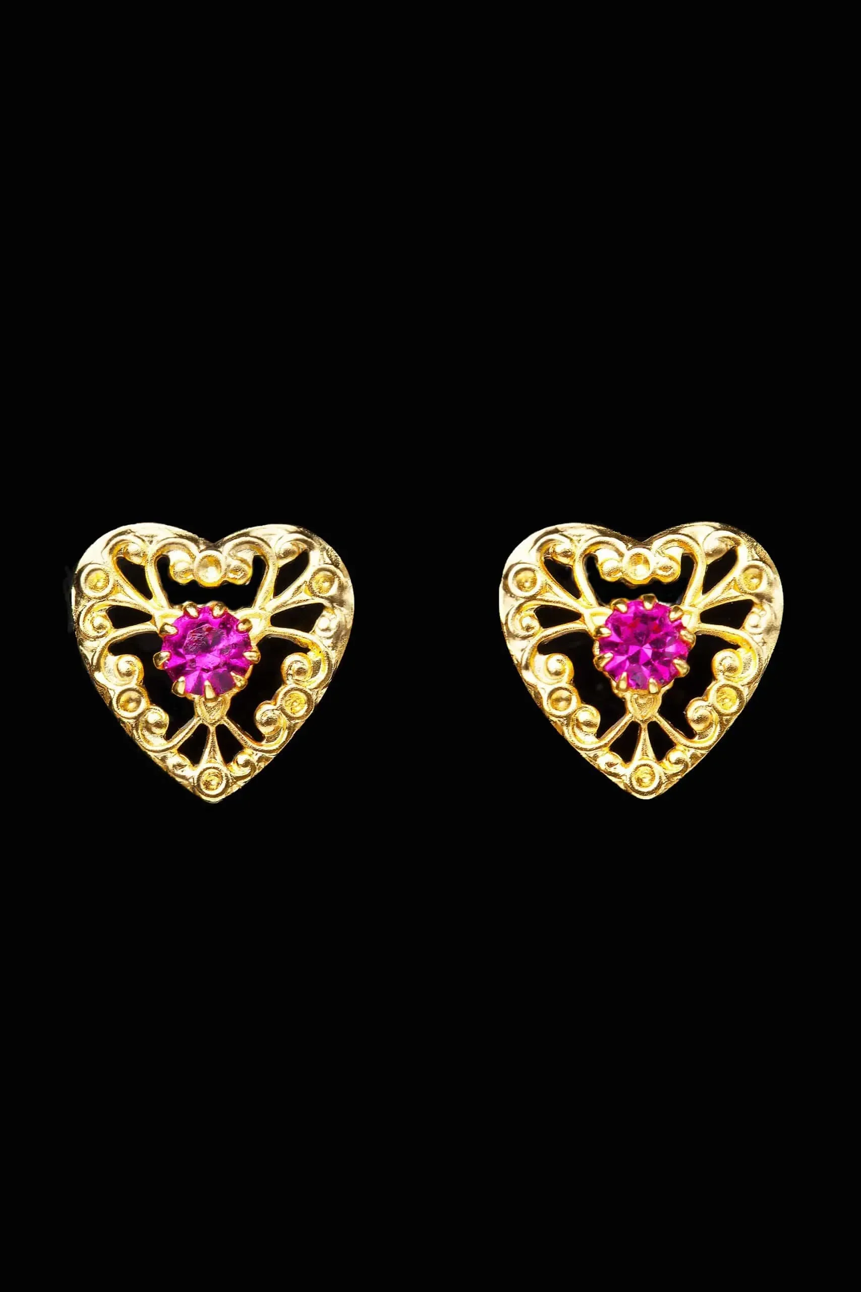 Introducing our exquisite Heart handmade vintage gold-plated bronze stud earrings, adorned with brilliant fuchsia Swarovski crystals. These earrings are the perfect combination of elegance and charm, adding a touch of vintage glamour to any outfit. The carefully crafted heart design is made from high-quality bronze and coated with a layer of lustrous gold plating, giving it a timeless appeal. The gorgeous fuchsia Swarovski crystals add a pop of colour and sparkle, making these earrings a statement piece. The silver 925 earwire ensures a comfortable and secure fit, making them suitable for all-day wear. These earrings are handmade with love and attention to detail, making each pair unique. Perfect for any special occasion or as a thoughtful gift, these Heart handmade vintage gold-plated bronze stud earrings are a must-have for any jewellery collection. Elevate your style with these stunning earrings and let your heart shine.