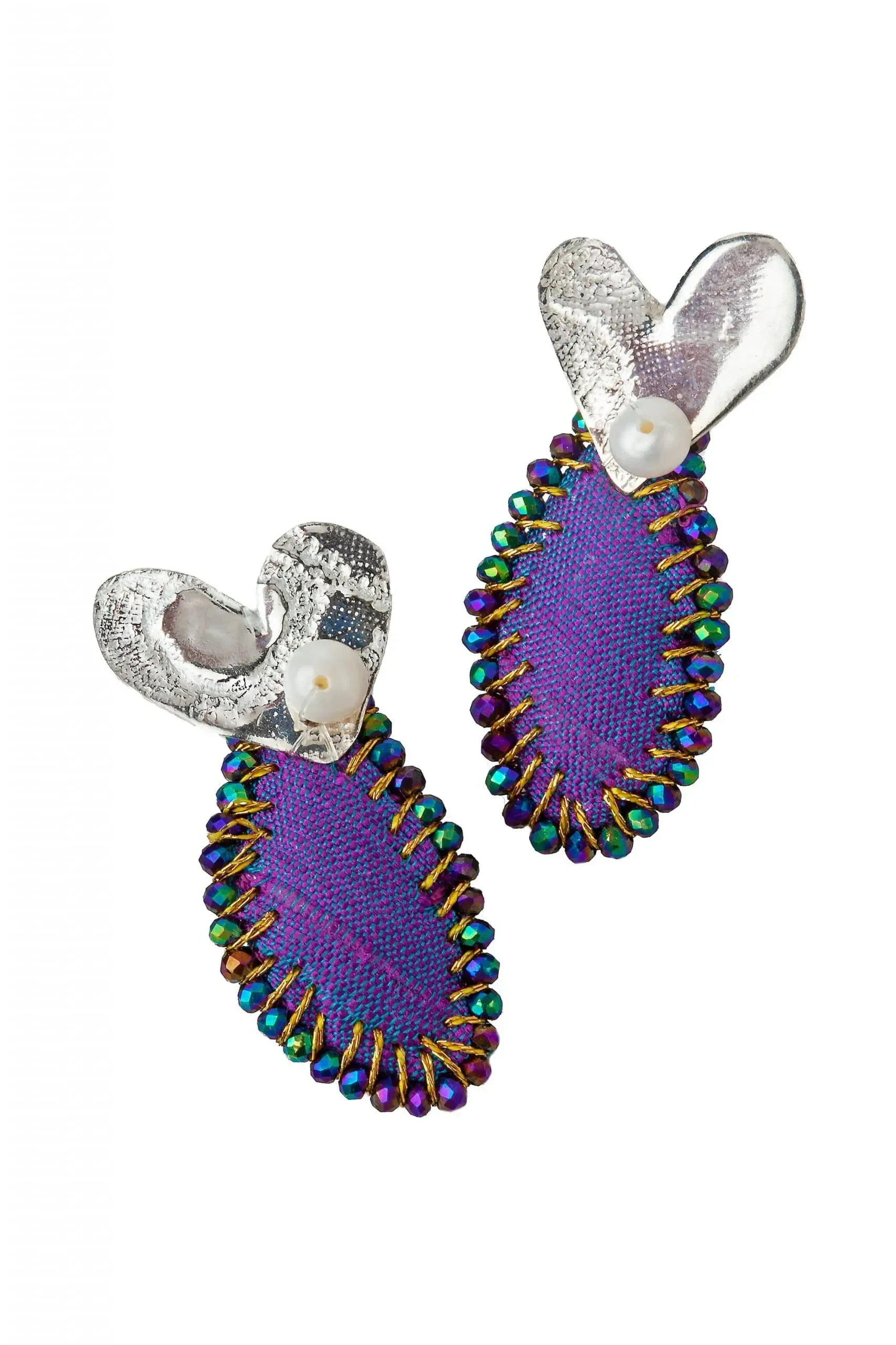 Hearts silver earrings with purple fabric, spinel and pearls