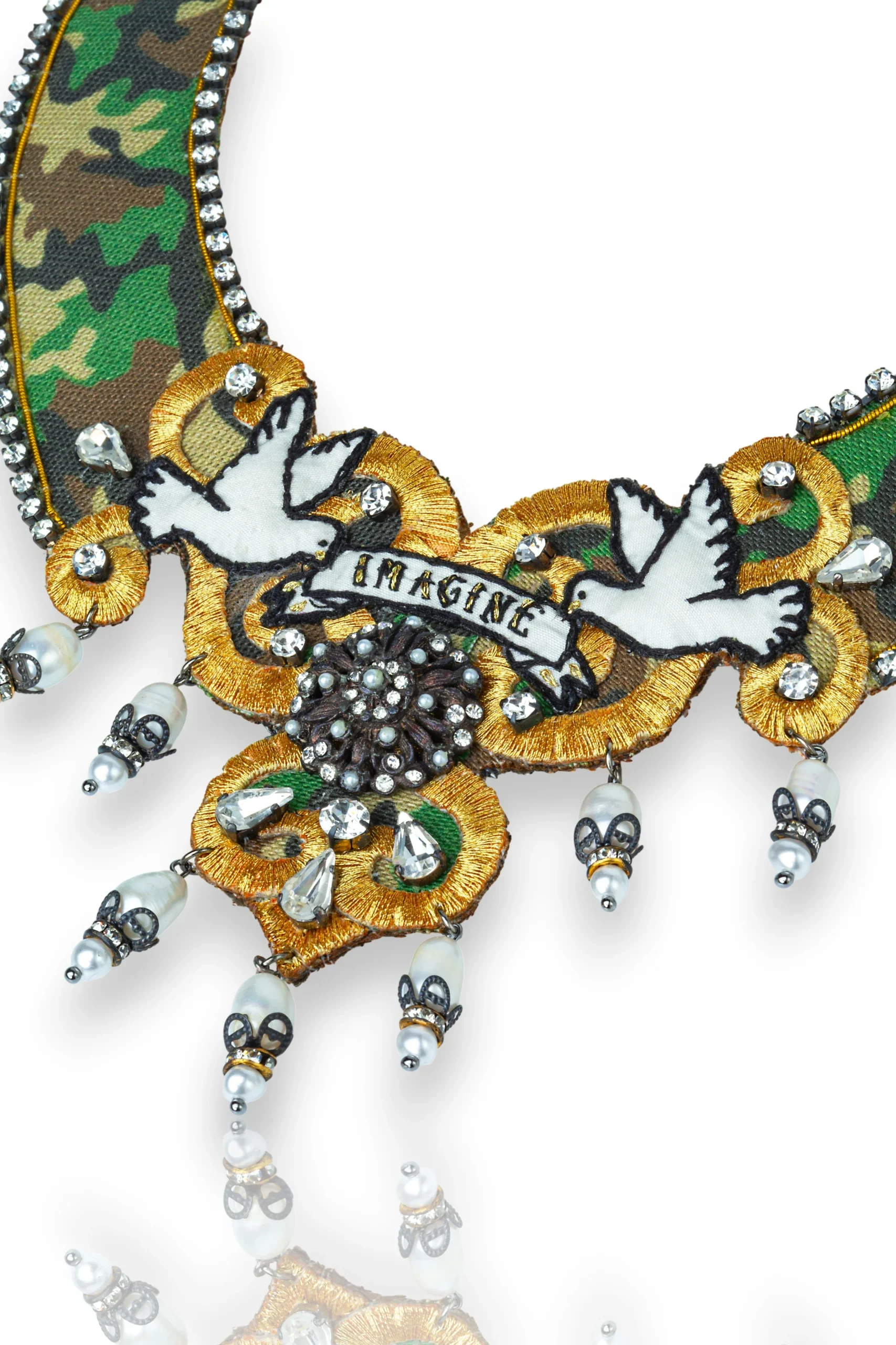 Design Focus: This handmade choker combines a bold camouflage textile with rich, symbolic details.