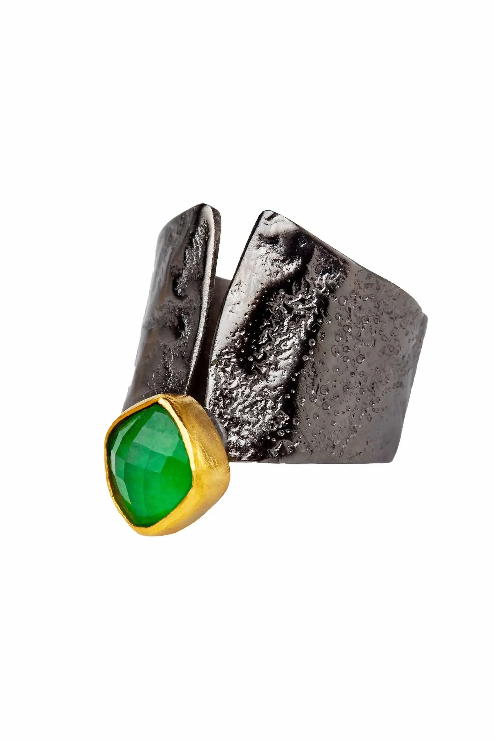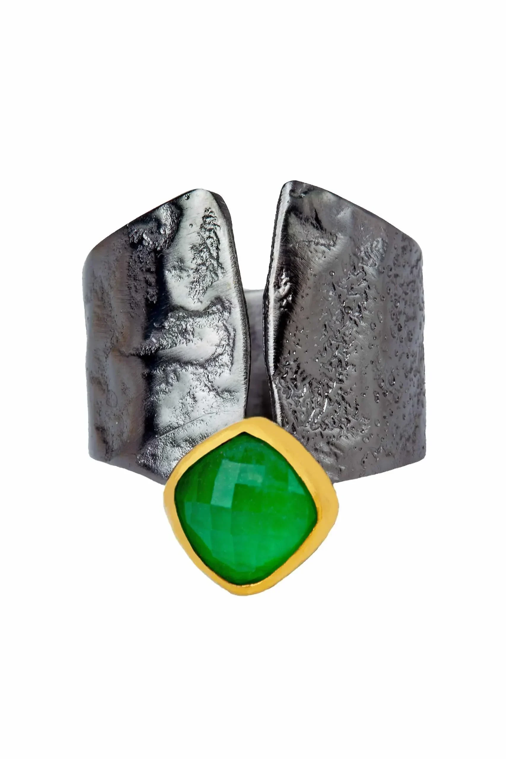 Jade black rhodium plated silver 925 textured ring with gold-plated detail. This beautiful jade gold and black rhodium plated silver ring is sure to make a statement. Add a touch of elegance to any outfit with this jewellery piece.
