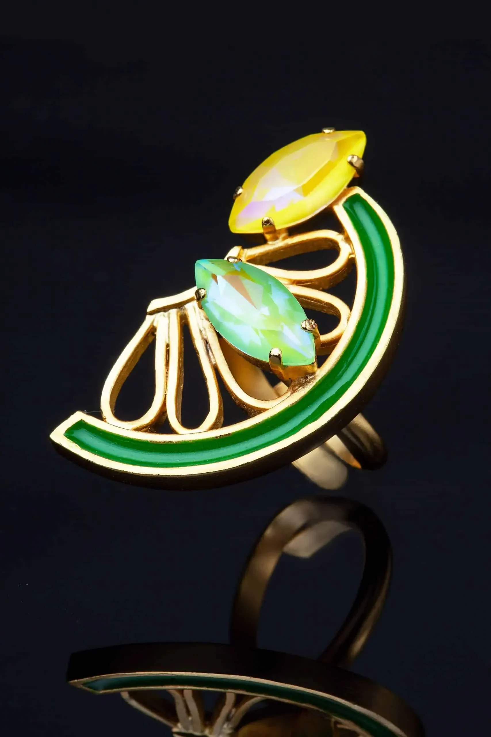 Lemon gold-plated bronze ring with Swarovski crystals and green enamel