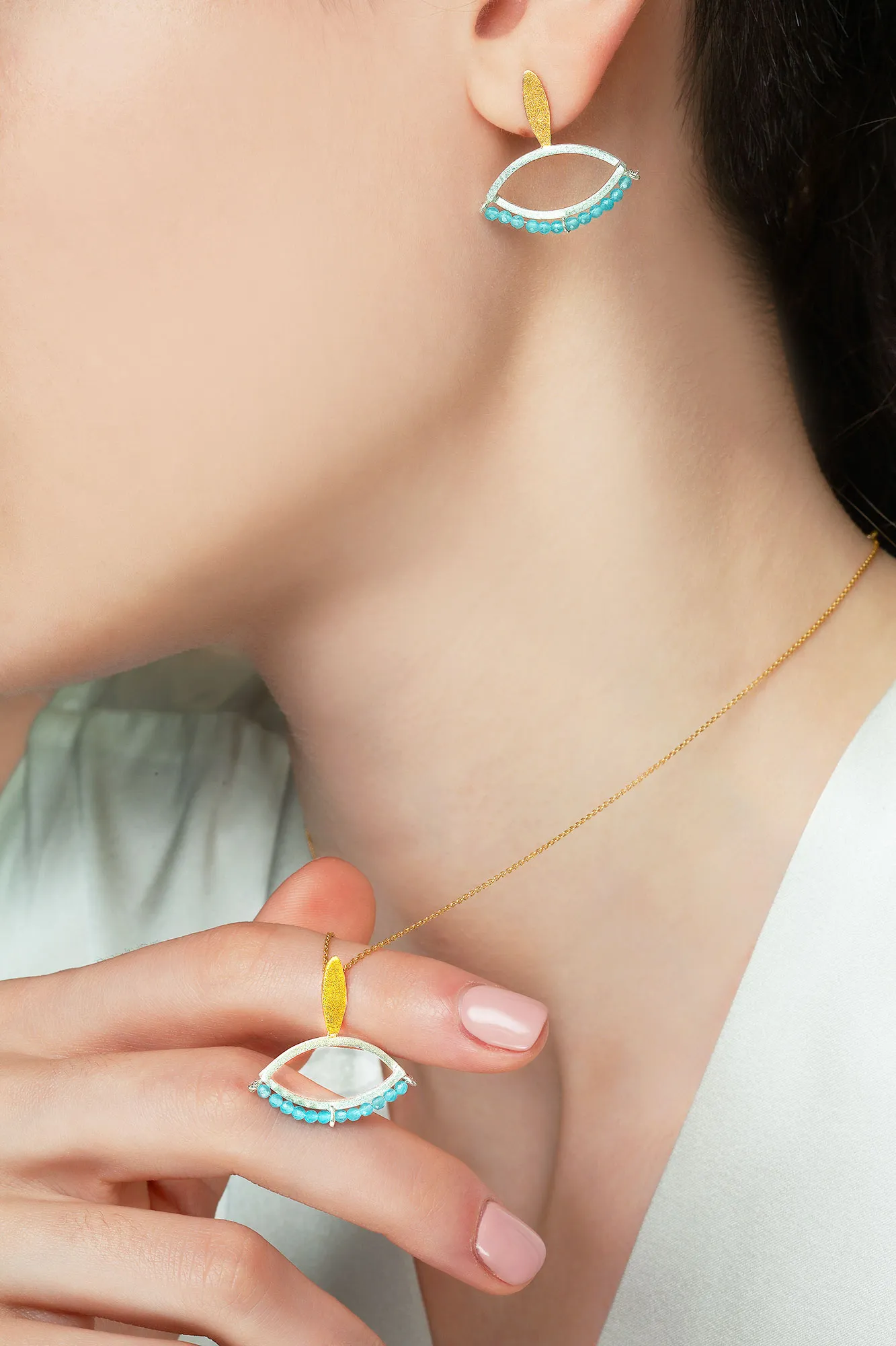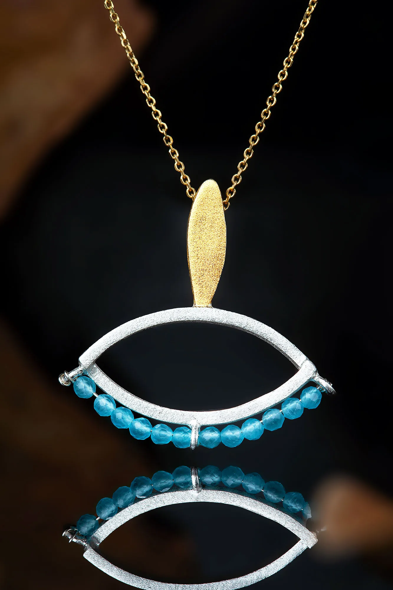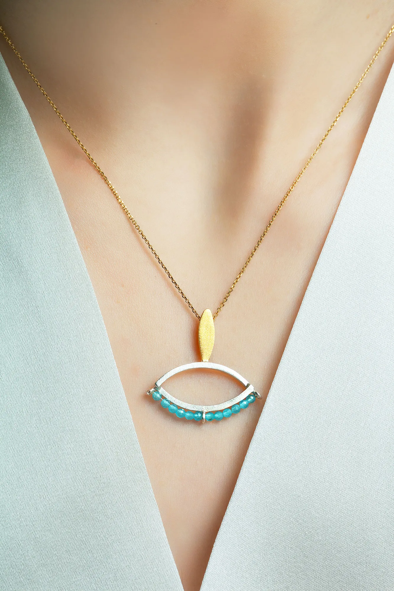 Introducing our minimal eye handmade silver necklace, adorned with a stunning aqua marine gemstone and delicate gold-plated detail. This elegant piece is perfect for adding a touch of sophistication to any outfit. Handcrafted with love and attention to detail, this necklace is truly one-of-a-kind. The aqua marine gemstone is known for its calming and soothing properties, making this necklace not only a beautiful accessory but also a source of positive energy. The minimal eye design adds a unique and modern touch, making it a must-have for any fashion-forward individual. Made with high-quality materials, this necklace is durable and long-lasting. Elevate your style and embrace the power of aqua marine with our handmade silver necklace.