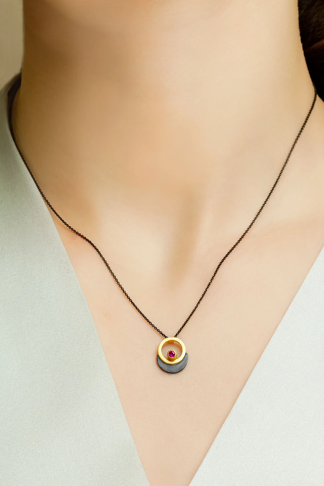 Elevate your style with our stunning minimal handmade silver necklace. Expertly crafted with gold and black rhodium plating, this necklace boasts a bold and vibrant fuchsia zircon stone. The perfect combination of elegance and edge, this necklace will add a pop of colour to any outfit. Each piece is carefully handcrafted, making it truly one-of-a-kind. With its durable materials and meticulous design, this necklace is sure to become a staple in your jewellery collection. A must-have for any fashion-forward individual, this necklace is the perfect accessory for any occasion. Shop now and make a statement with our unique and luxurious handmade necklace.
