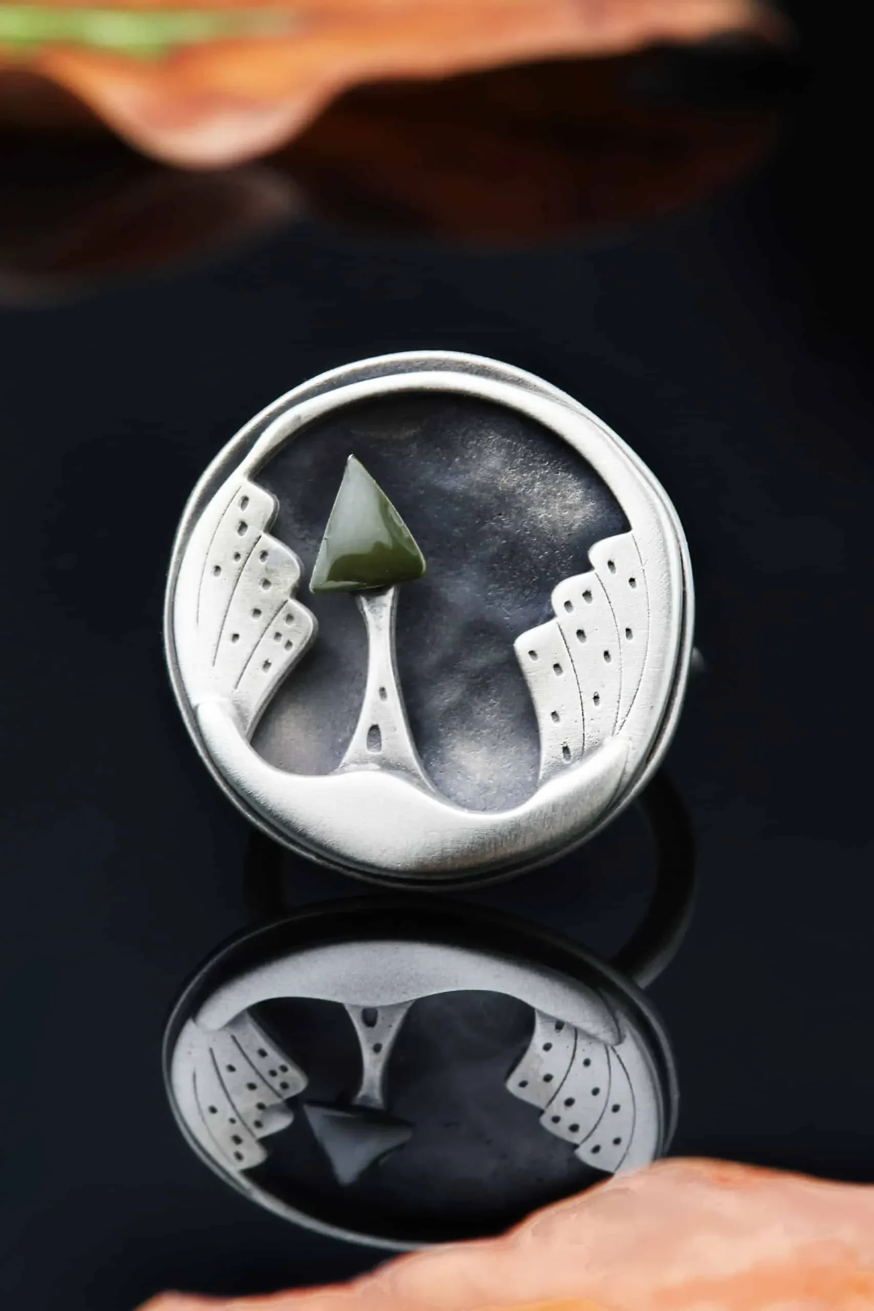 Night city handmade oxidized round silver ring with enamel green enamel