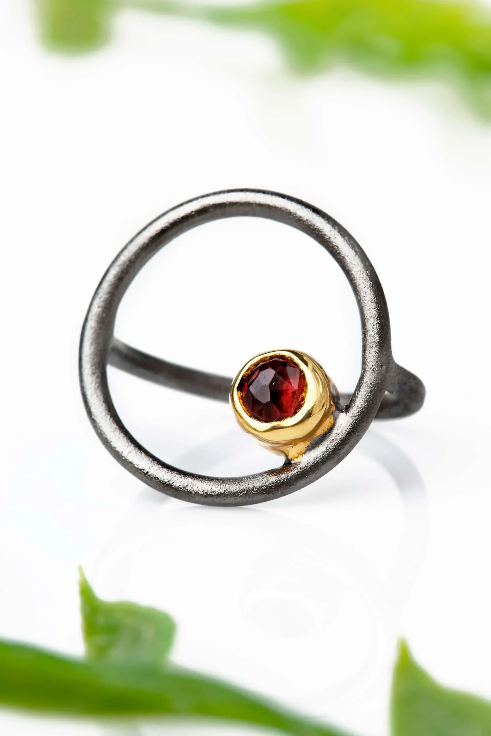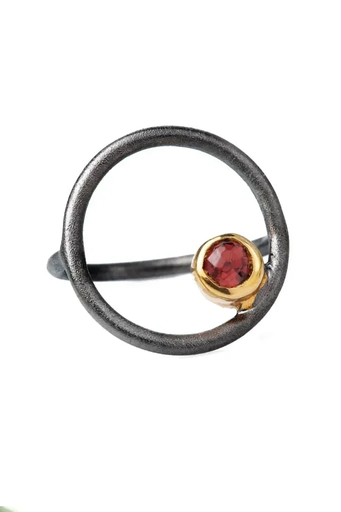 Round black rhodium plated silver ring with garnet