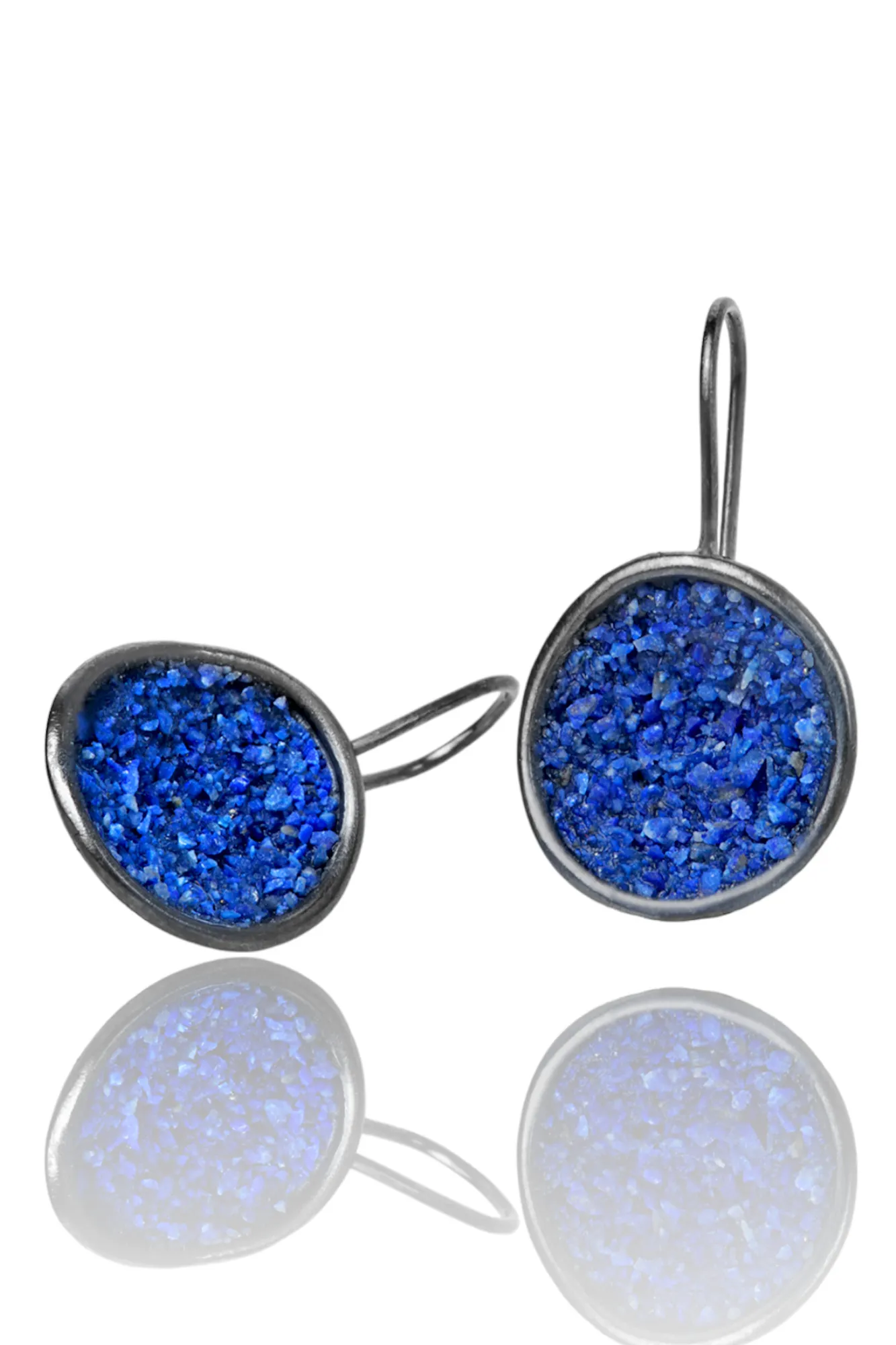 Introducing our stunning Round Black Rhodium Plated Silver Earrings with Lapis Lazuli – the perfect combination of elegance and edge. These earrings feature a sleek black rhodium plating, adding a touch of sophistication to the striking deep blue hue of the lapis lazuli stones. Each stone is carefully handcrafted into a round shape, creating a unique and eye-catching design. The rhodium plating also provides durability and protects against tarnishing, ensuring these earrings will remain a timeless piece in your collection. Perfect for any occasion, these earrings will elevate any outfit and make a statement. Don’t miss out on owning a pair of these one-of-a-kind earrings. Order now and add a touch of luxury to your jewellery collection.