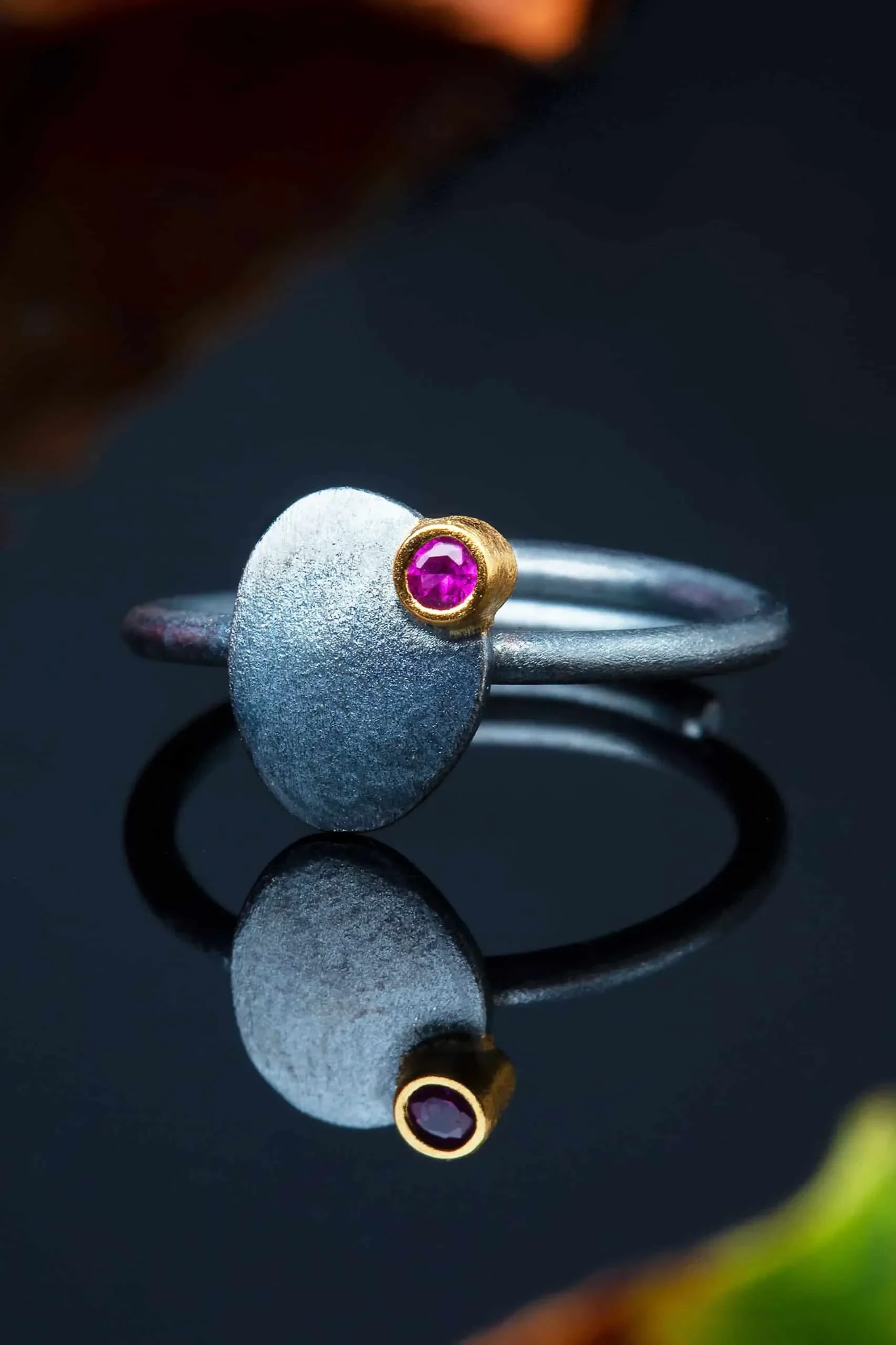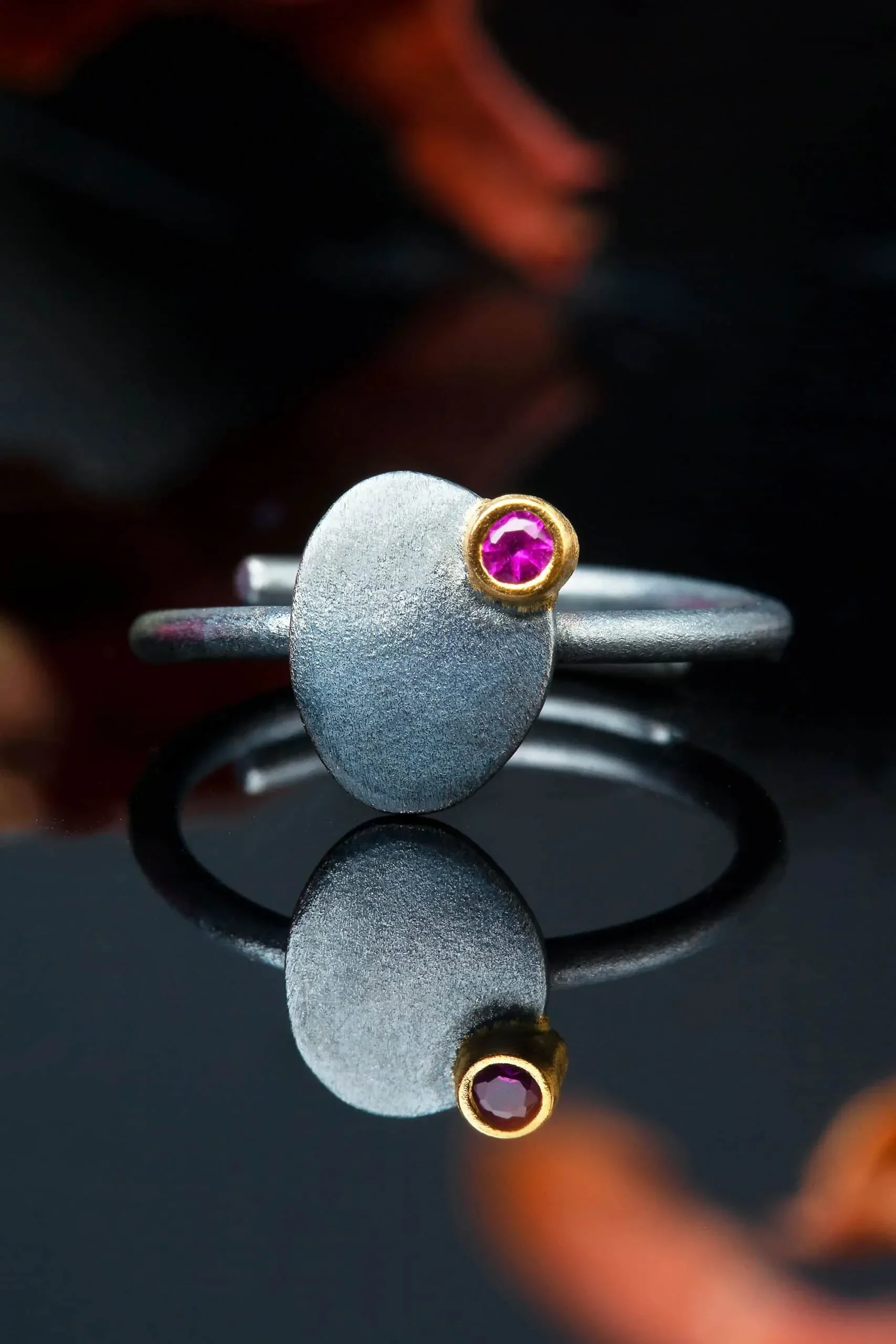Silver adjustable ring, black rhodium plated with gold-plated detail and pink zircon
