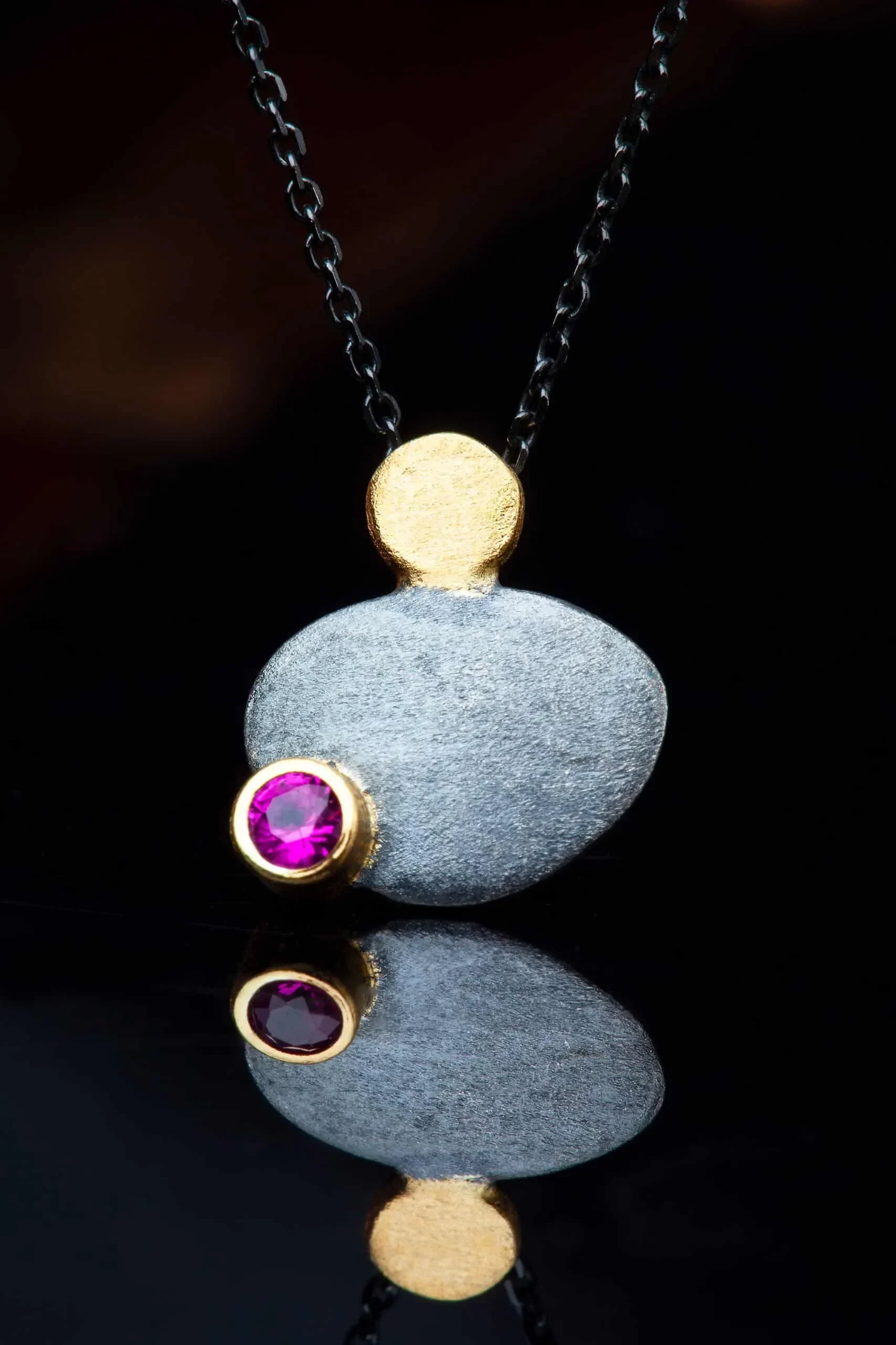 Silver round necklace, black rhodium plated with gold-plated detail and pink zircon