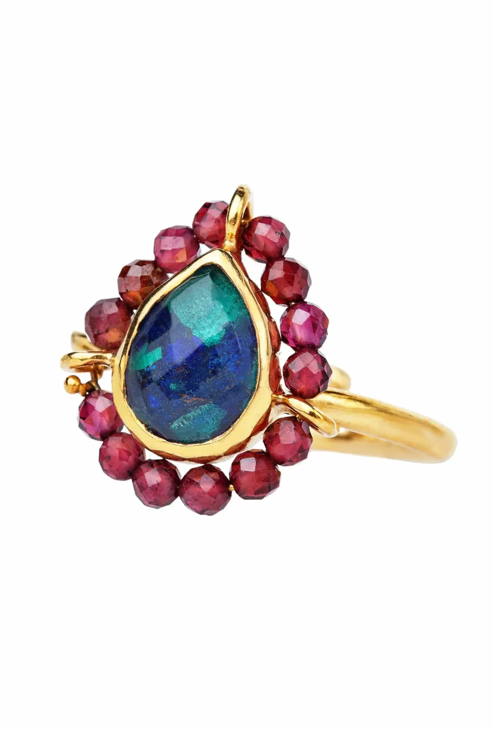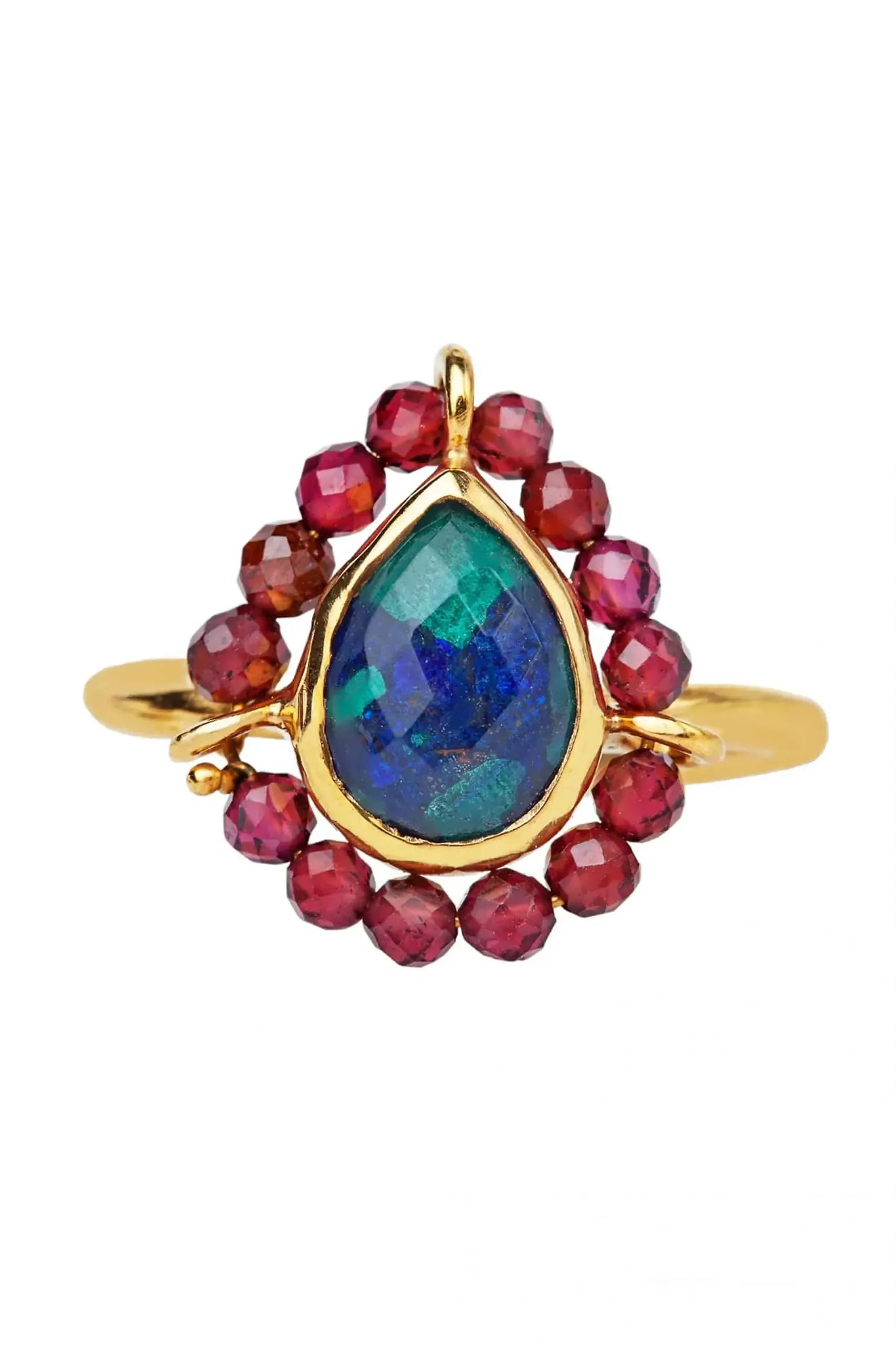 Tear shaped azurite and malachite gold-plated silver adjustable ring with garnet