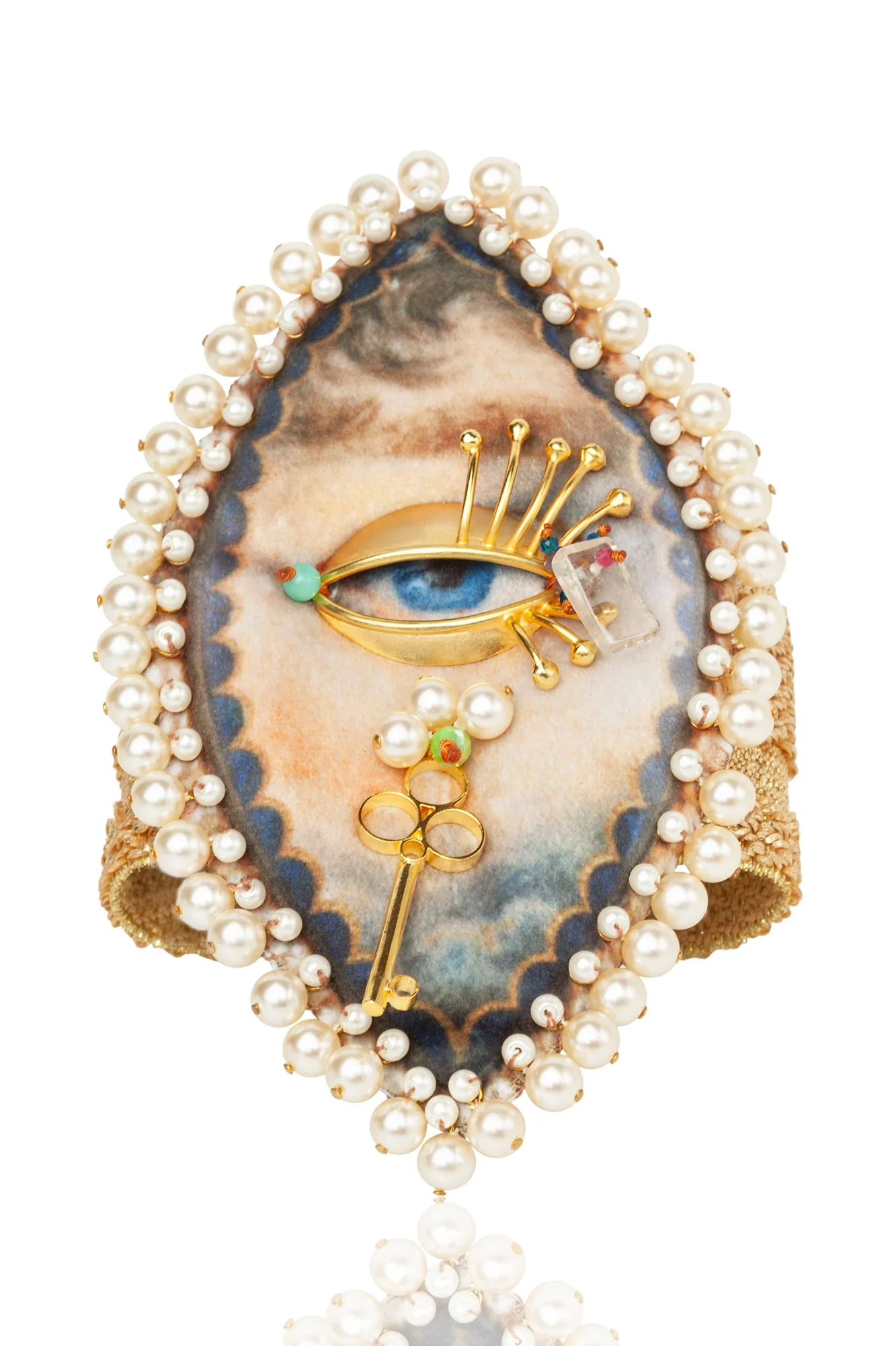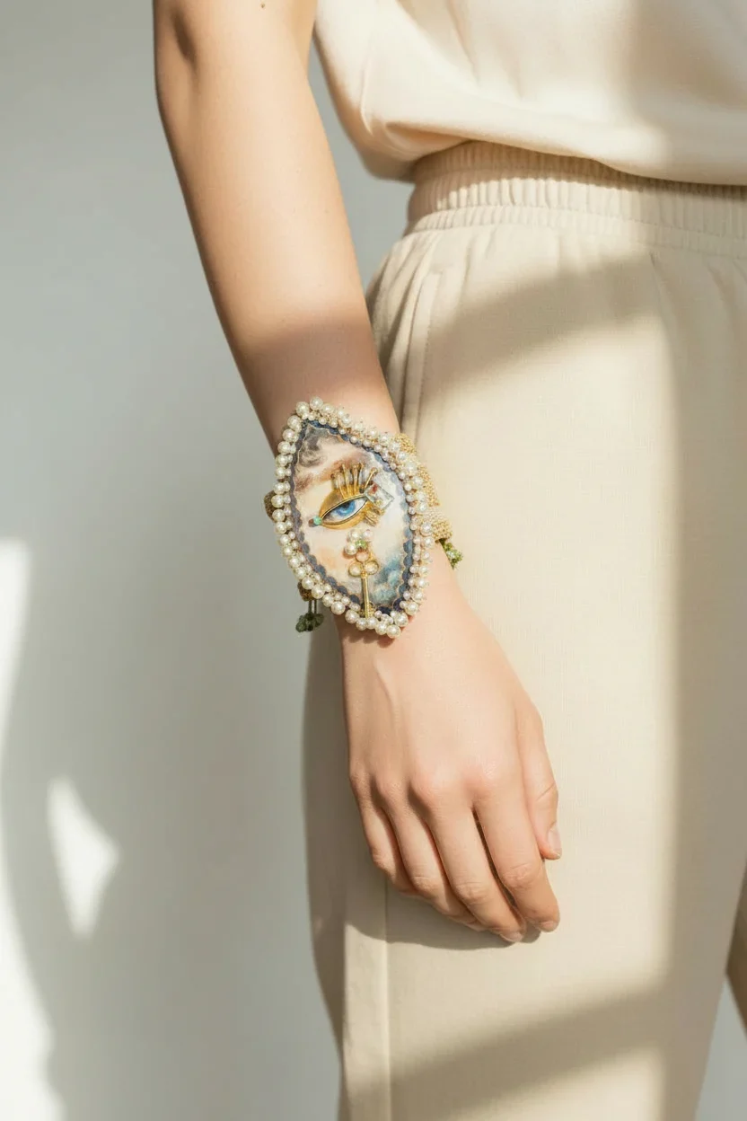 Embrace the art of the “Lover’s Eye” with this avant-garde statement bracelet. Featuring a detailed, hand-rendered eye miniature framed by a double row of lustrous seed pearls. This piece bridges the gap between neoclassical sentimentality and modern surrealism.