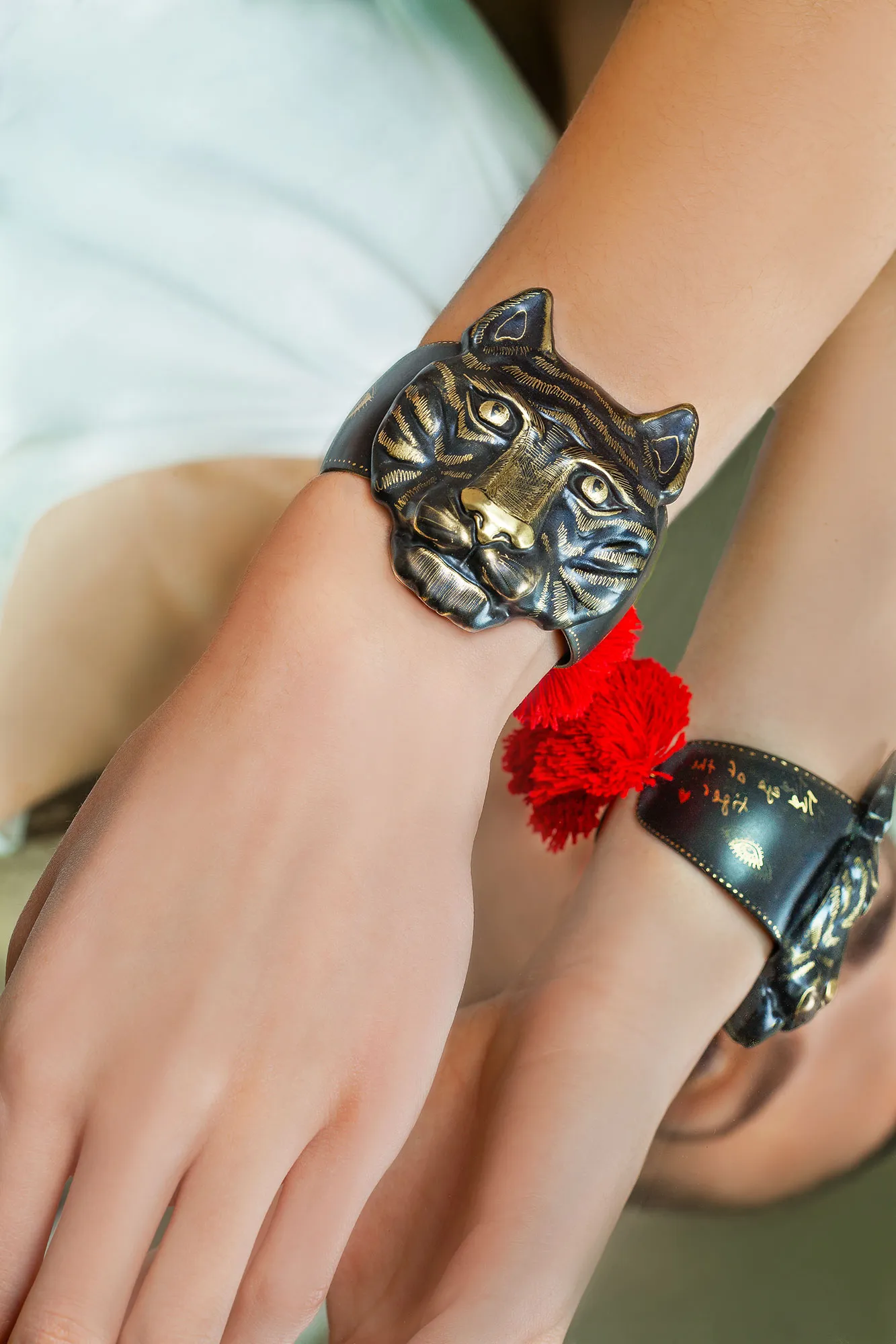 Introducing our exquisite Tiger handmade engraved bronze bracelet with red tassels – a must-have accessory for the fierce and fashion-forward. This stunning piece is meticulously crafted by skilled artisans, featuring intricate tiger engravings on a high-quality bronze band. The vibrant red tassels add a touch of playful elegance, making it a versatile accessory for any occasion. Lightweight and adjustable, this bracelet is comfortable to wear and can easily be paired with any outfit. Whether you’re looking to make a bold statement or add a touch of exotic charm to your look, our Tiger bracelet is the perfect choice. Elevate your style and channel your inner wild side with our unique and eye-catching bracelet. Order now and unleash your fashion prowess with our Tiger handmade engraved bronze bracelet with red tassels.