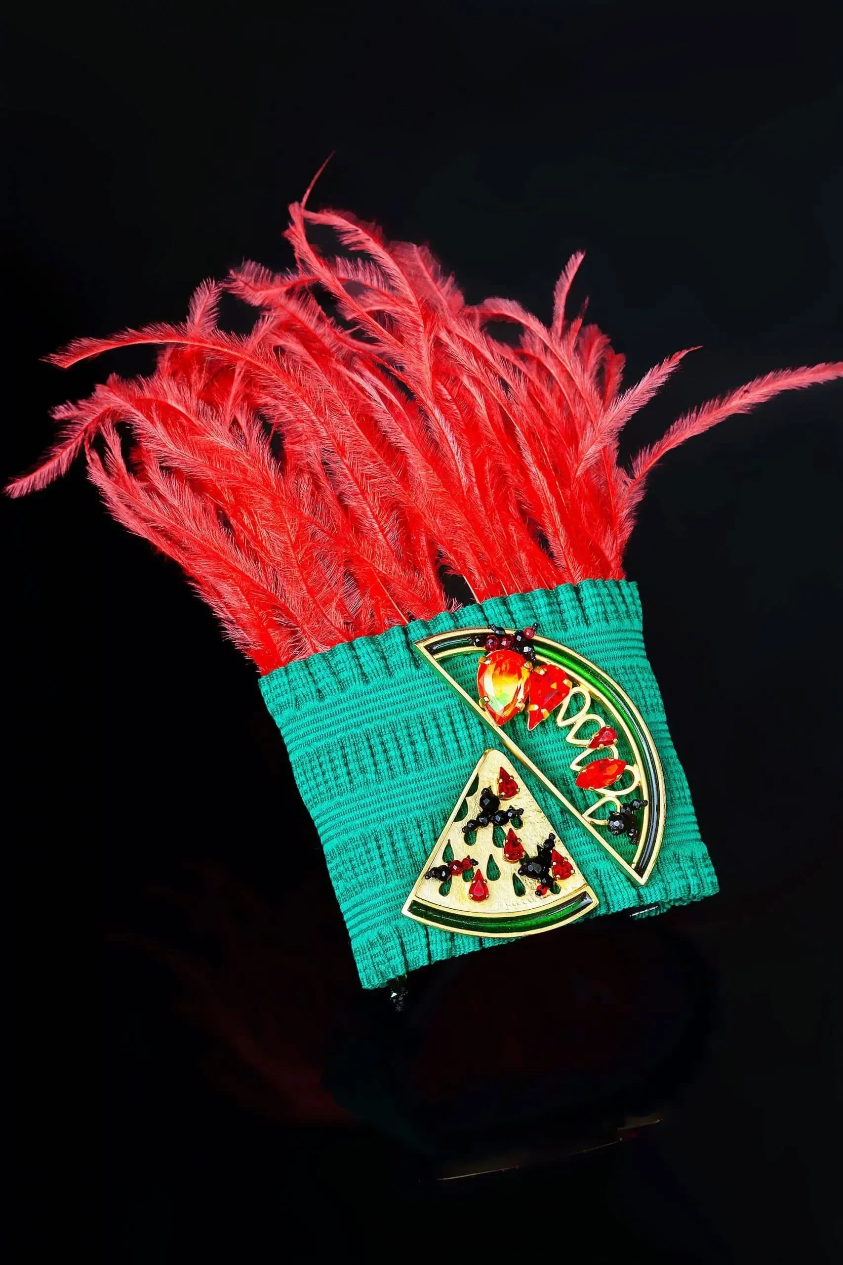 Watermelon gold-plated bronze bracelet with Swarovski crystals, fabrics and feathers