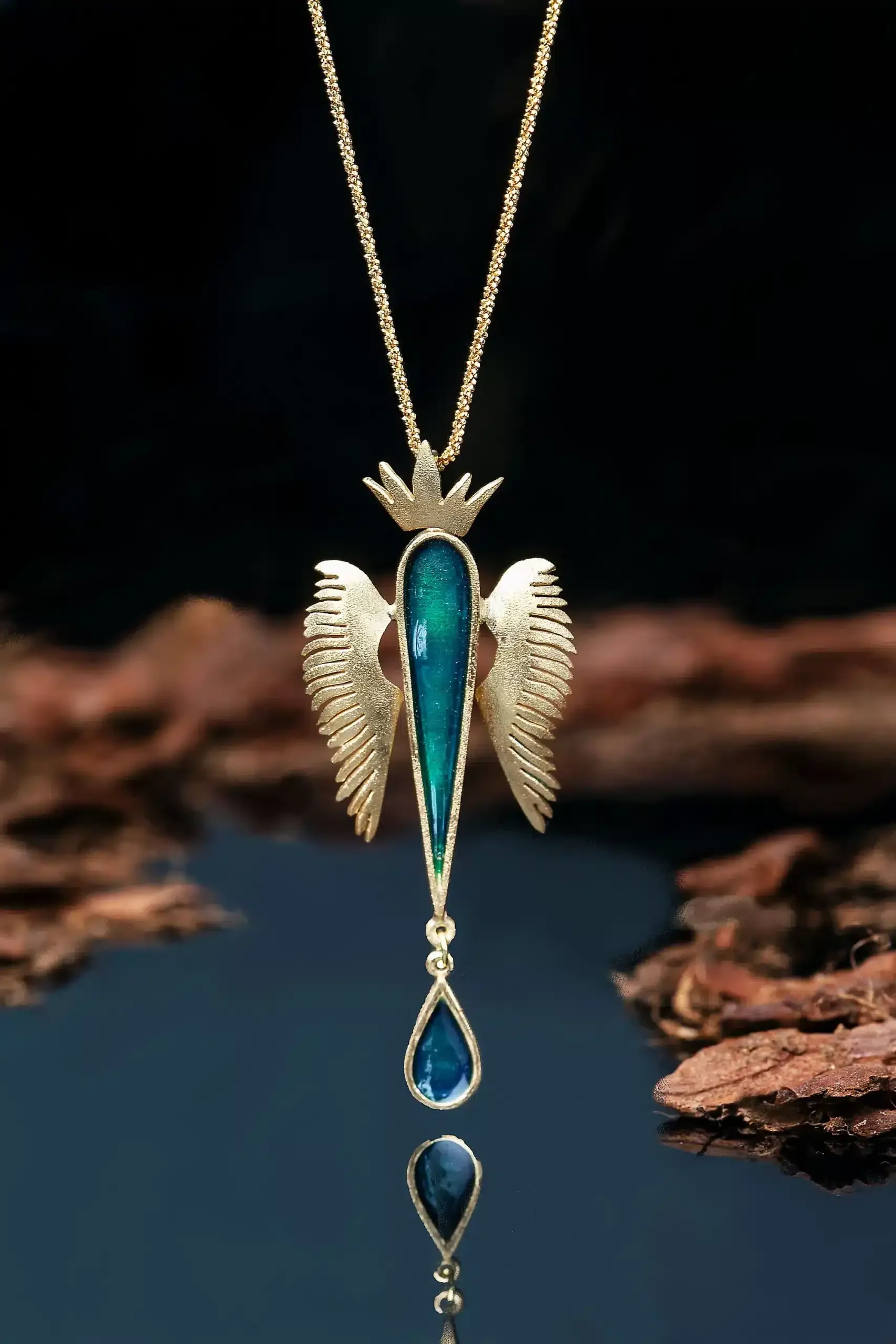 Angel wings gold plated silver necklace with green enamel