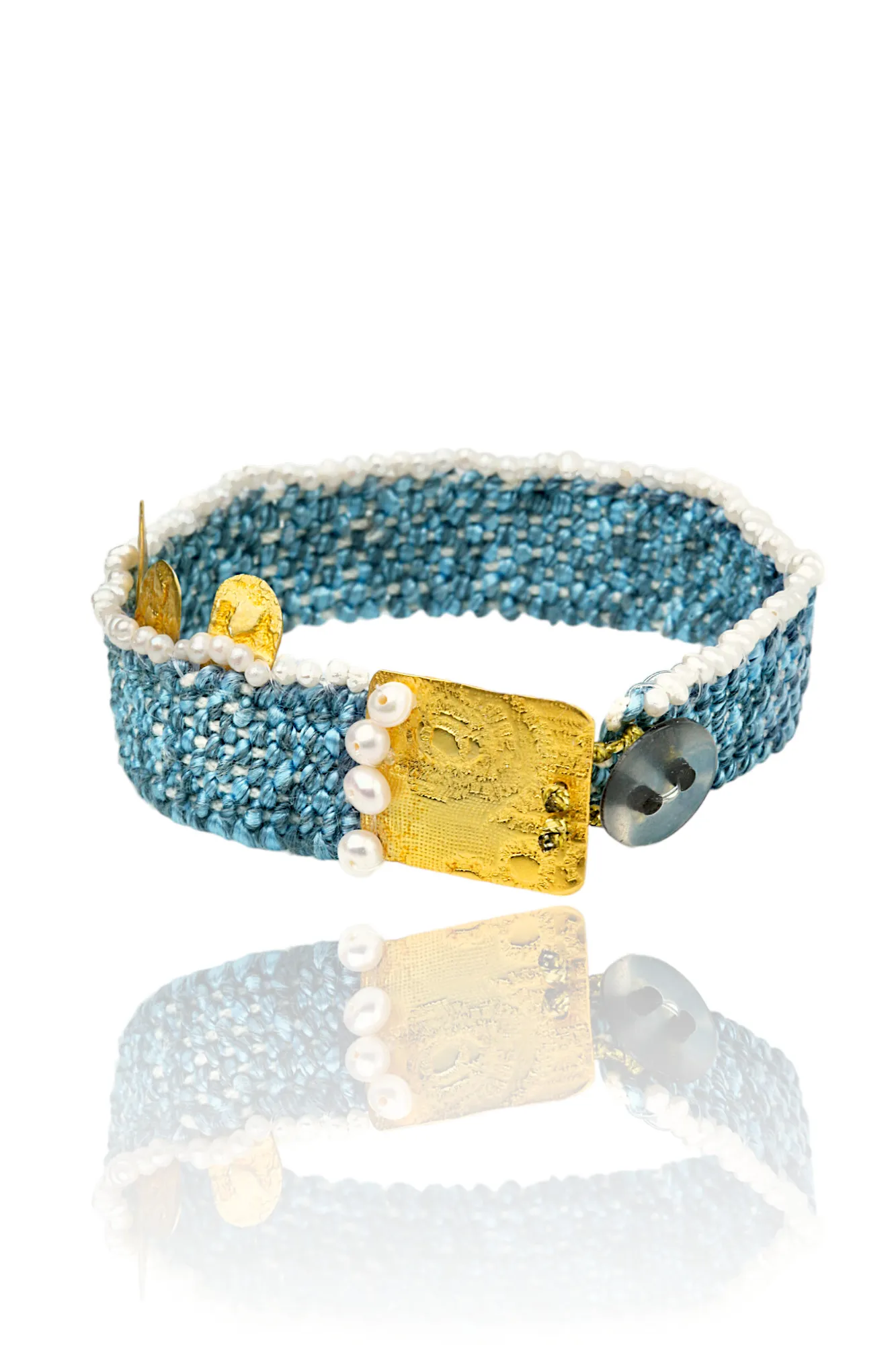 Woven blue bracelet with gold-plated silver 1000 element and pearls